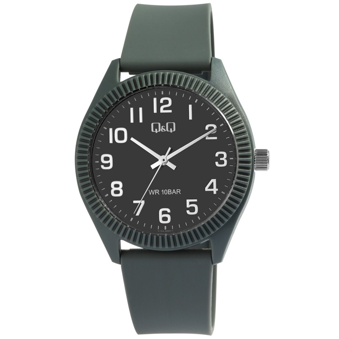 O relógio de pulso unissexo analógico de 3 ponteiros da marca Q&Q possui um movimento de quartzo preciso e de alta qualidade. A pulseira de silicone cinza tem 21 mm de largura na alça e pode ser aberta e fechada com uma fivela cinza. O comprimento total do relógio é de 25 cm. A caixa de plástico cinza com vidro mineral tem um diâmetro de 41 mm e uma altura de 11 mm. A parte traseira da caixa é feita de aço inoxidável e fixada à caixa com quatro parafusos de aço inoxidável. A hora pode ser facilmente lida graças ao mostrador cinza com números brancos em estilo árabe. Além disso, o relógio é confortável de usar graças à pulseira de silicone macia e pode ser combinado maravilhosamente graças ao design desportivo. O material também se mostra particularmente amigo da pele e, portanto, ideal para quem sofre de alergias.