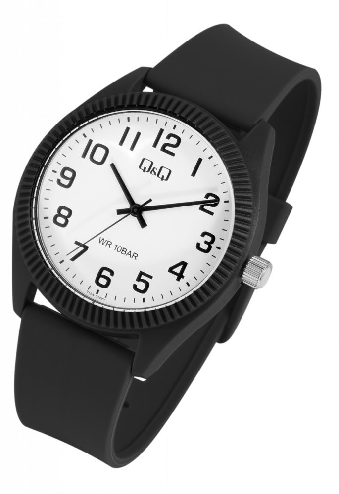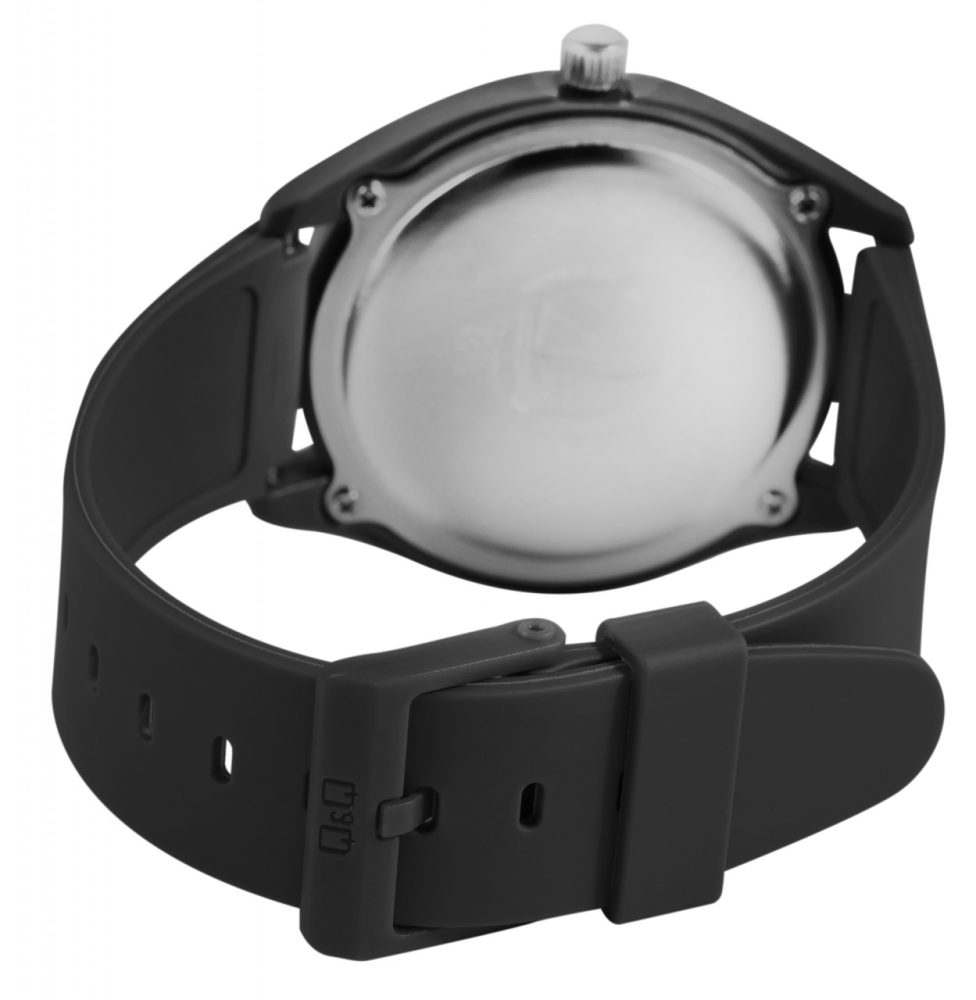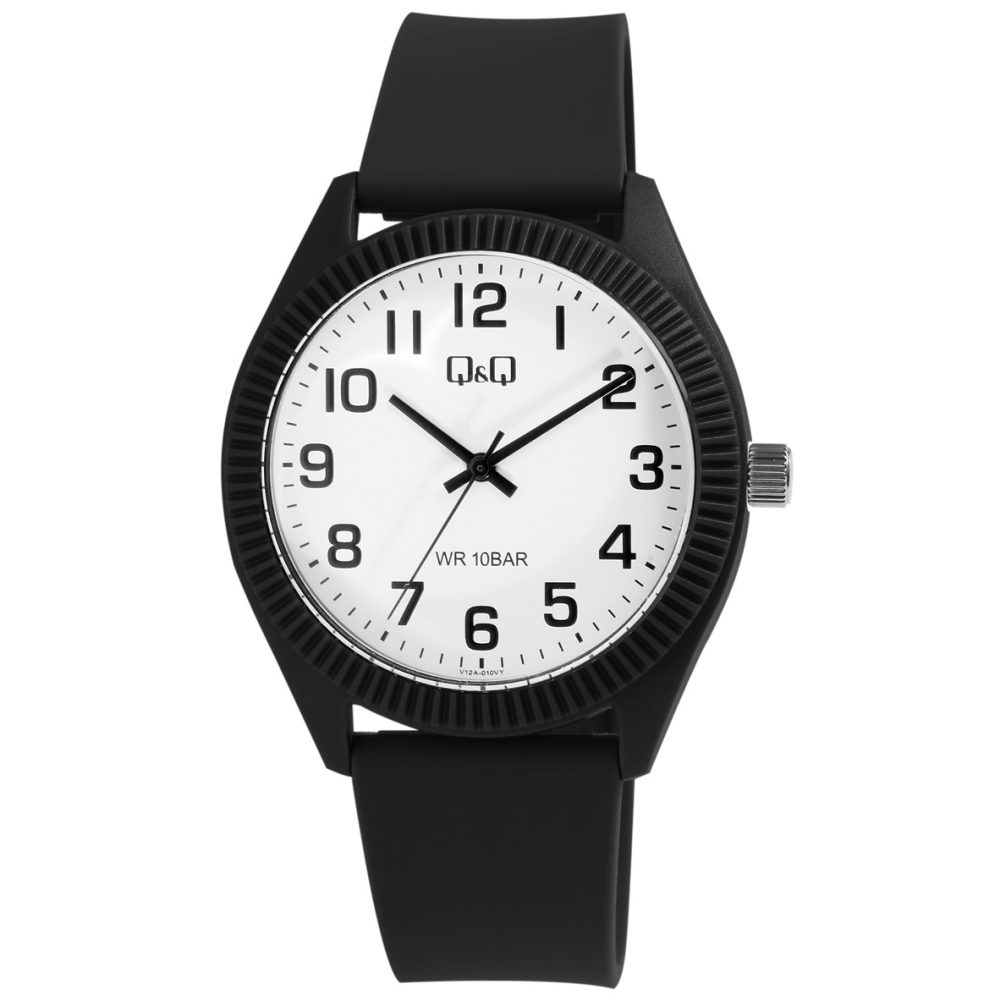 O relógio de pulso unissexo analógico de 3 ponteiros da marca Q&Q possui um movimento de quartzo preciso e de alta qualidade. A pulseira de silicone preta tem 21 mm de largura na alça e pode ser aberta e fechada com uma fivela preta. O comprimento total do relógio é de 25 cm. A caixa de plástico preto com vidro mineral tem um diâmetro de 41 mm e uma altura de 11 mm. A parte traseira da caixa é feita de aço inoxidável e fixada à caixa com quatro parafusos de aço inoxidável. A hora pode ser facilmente lida graças ao mostrador branco com algarismos pretos em estilo árabe. Além disso, o relógio é confortável de usar graças à pulseira de silicone macia e pode ser combinado maravilhosamente graças ao design desportivo. O material também se mostra particularmente amigo da pele e, portanto, ideal para quem sofre de alergias.