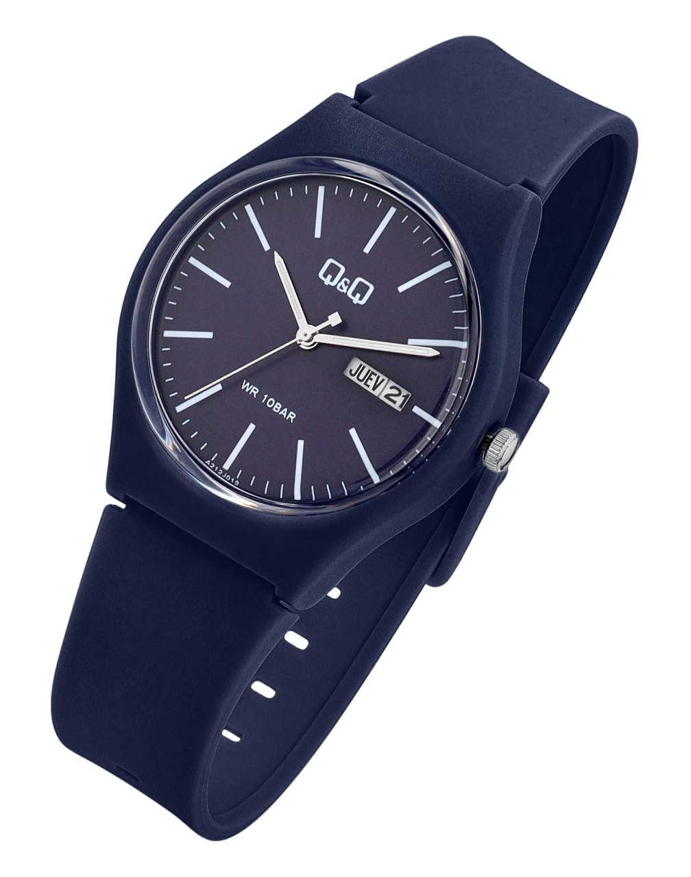 Este relógio de pulso azul escuro da marca Q&Q não só impressiona pelo seu visual especial, mas também pela sua qualidade de primeira classe. O movimento de quartzo de alta qualidade garante uma cronometragem precisa na qual os seus clientes podem confiar. Mas isso não é tudo. Este relógio também oferece exibição da data e do dia da semana na posição das três horas, tornando-o um companheiro extremamente prático para o dia a dia. Com uma impressionante resistência à água de 10 bar, este relógio está pronto para qualquer desafio. Os seus clientes podem usá-los na piscina sem hesitação ou até mesmo durante um mergulho. A pulseira de silicone não só oferece conforto, mas também é extremamente durável e insensível. A caixa em azul escuro profundo é feita de plástico robusto e confere ao relógio um visual moderno.