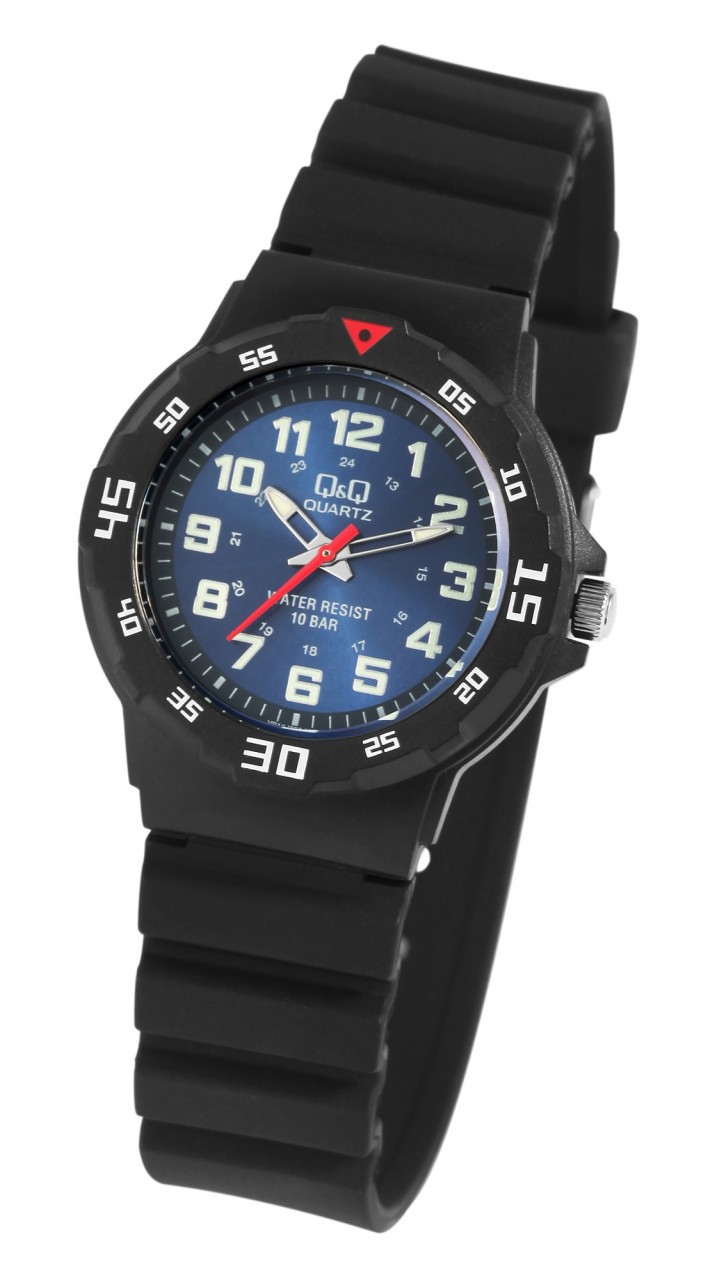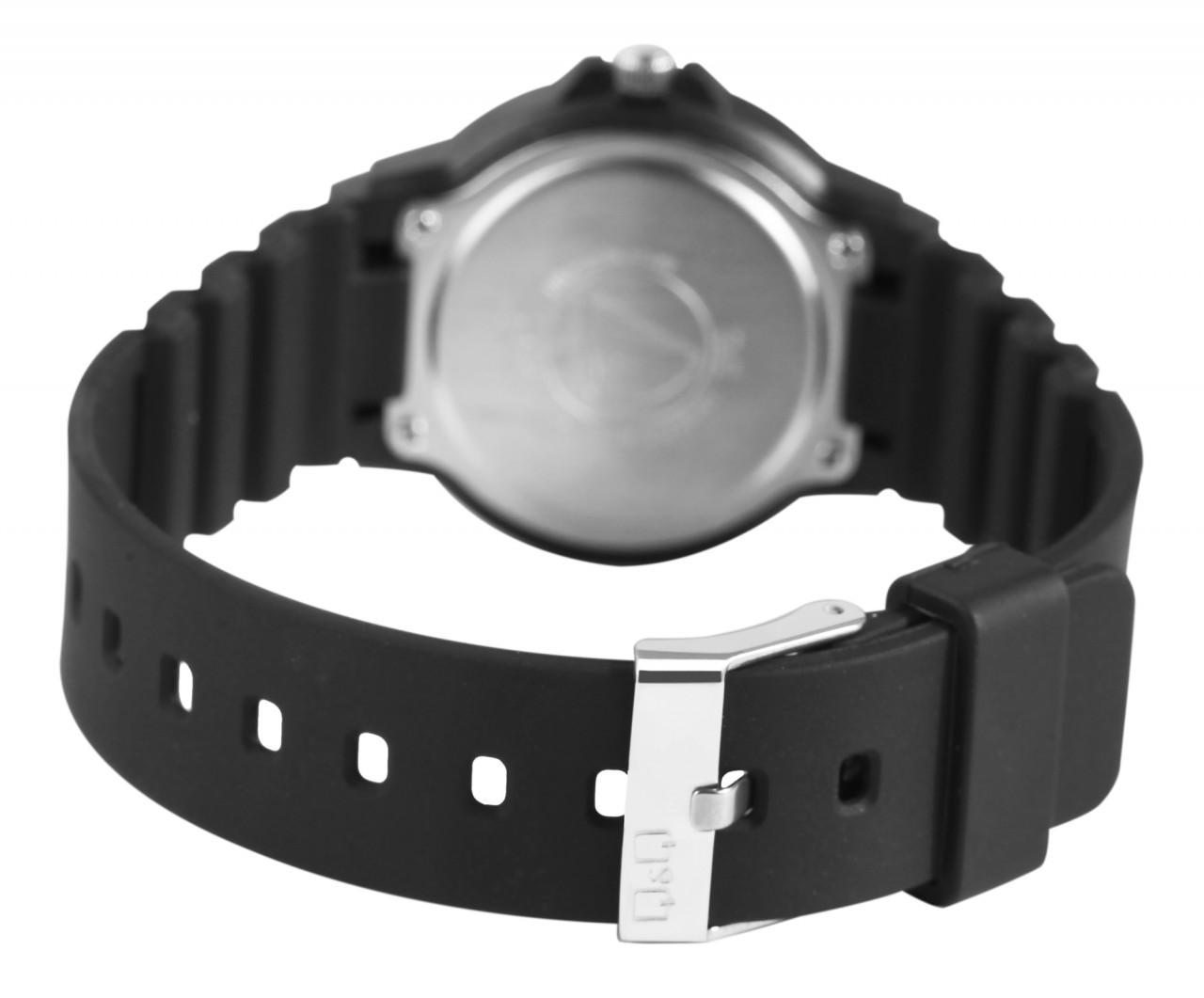 O relógio de pulso analógico de 3 ponteiros da marca Q&Q possui um movimento de quartzo de alta qualidade e precisão. A bracelete de silicone preta tem 18 mm de largura na extremidade e pode ser aberta e fechada com uma fivela de aço inoxidável prateada. O comprimento total do relógio é de 24 cm. A caixa de plástico preto com vidro mineral tem um diâmetro de 33 mm e uma altura de 9,5 mm. O fundo da caixa é feito de aço inoxidável e é fixado à caixa com quatro parafusos de aço inoxidável. O mostrador azul com algarismos de estilo árabe facilita a leitura das horas. Isto também é possível no escuro graças aos ponteiros e índices revestidos a Superluminova. O relógio de pulso também é confortável de usar graças à bracelete de silicone macia e é particularmente fácil de limpar graças aos materiais de fácil manutenção.