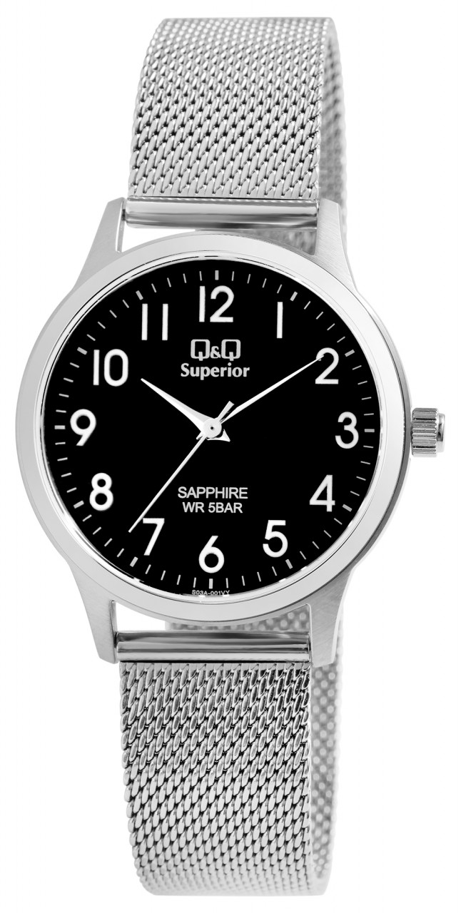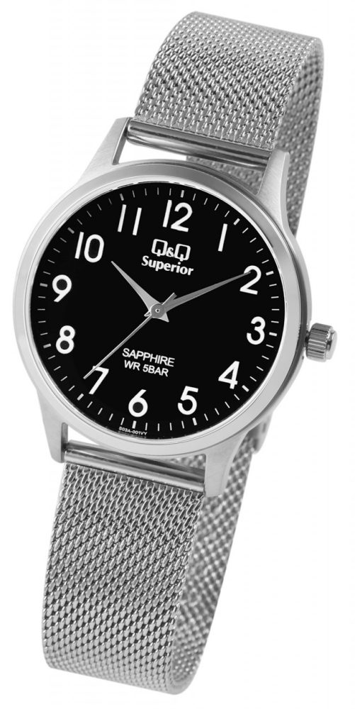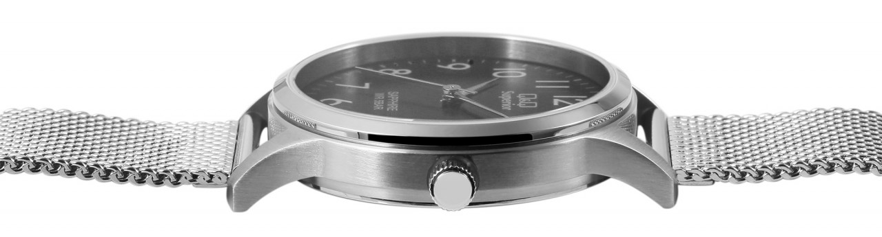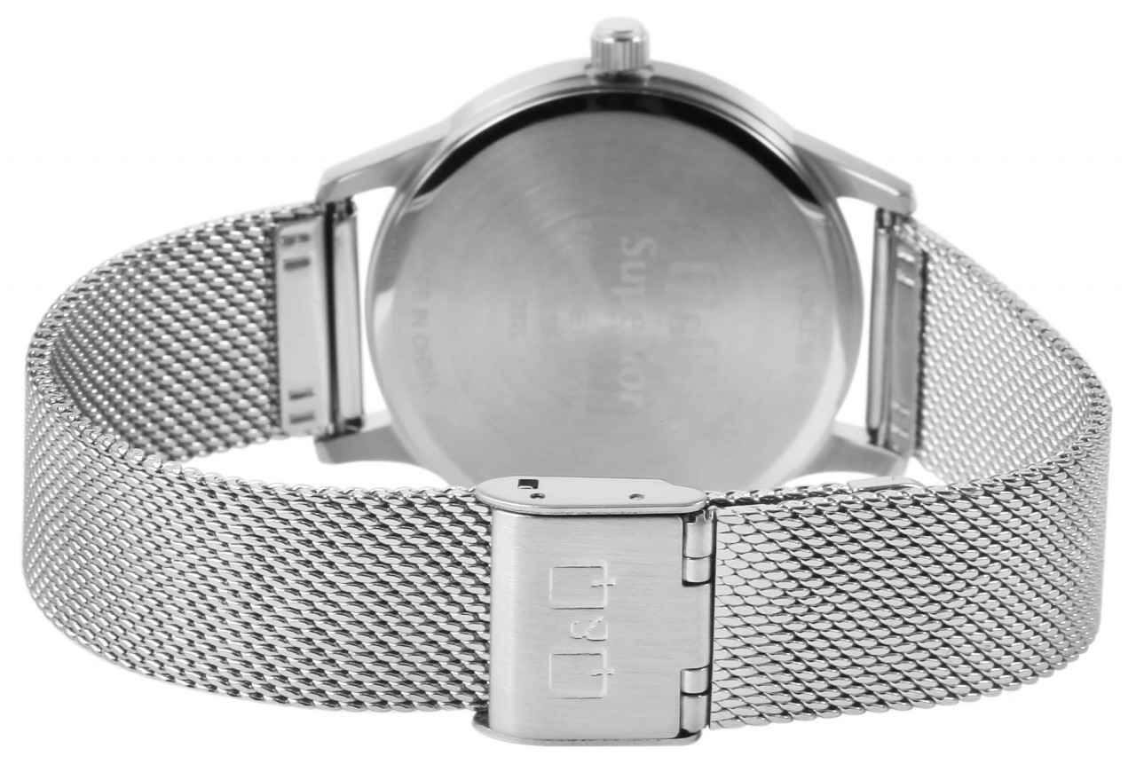O relógio de pulso analógico de 3 ponteiros da marca Q&Q possui um movimento de quartzo preciso e de alta qualidade da marca Miyota. A pulseira de malha prateada tem 18 mm de largura nas alças e pode ser aberta e fechada com fecho de gancho. A pulseira do relógio é muito confortável de usar graças ao seu design especial e pode ser perfeitamente ajustada a qualquer pulso graças ao ajuste fino. A combinação de elementos clássicos do relógio com design moderno faz do relógio um acessório especial. O comprimento total do relógio é de 23 cm. A caixa do relógio prateada com cristal de safira tem um diâmetro de 36 mm e uma altura de caixa de 8 mm. A hora pode ser facilmente lida graças ao mostrador preto com números brancos em estilo árabe. O fundo da caixa também é feito de aço inoxidável e o relógio tem resistência à água de 5 bar.
