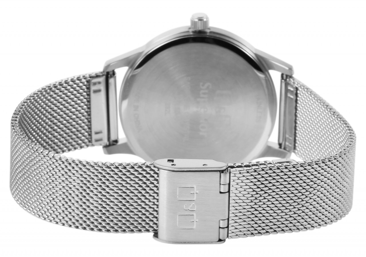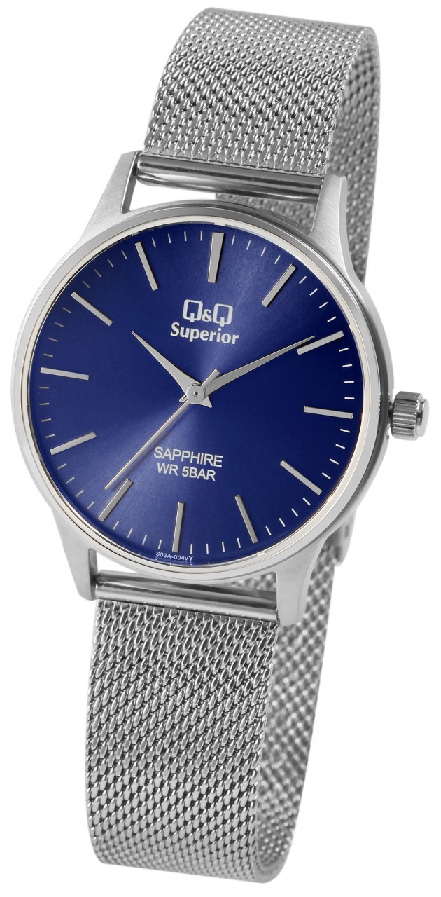 O relógio de pulso analógico de 3 ponteiros da marca Q&Q possui um movimento de quartzo preciso e de alta qualidade da marca Miyota. A pulseira de malha prateada tem 18 mm de largura nas alças e pode ser aberta e fechada com fecho de gancho. A pulseira do relógio é muito confortável de usar graças ao seu design especial e pode ser perfeitamente ajustada a qualquer pulso graças ao ajuste fino. A combinação de elementos clássicos do relógio com design moderno faz do relógio um acessório especial. O comprimento total do relógio é de 23 cm. A caixa do relógio prateada com cristal de safira tem um diâmetro de 36 mm e uma altura de caixa de 8 mm. A hora pode ser facilmente lida através do mostrador azul com índices prateados. O fundo da caixa também é feito de aço inoxidável e o relógio tem resistência à água de 5 bar.
