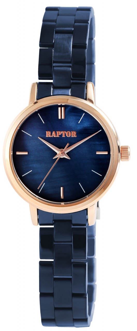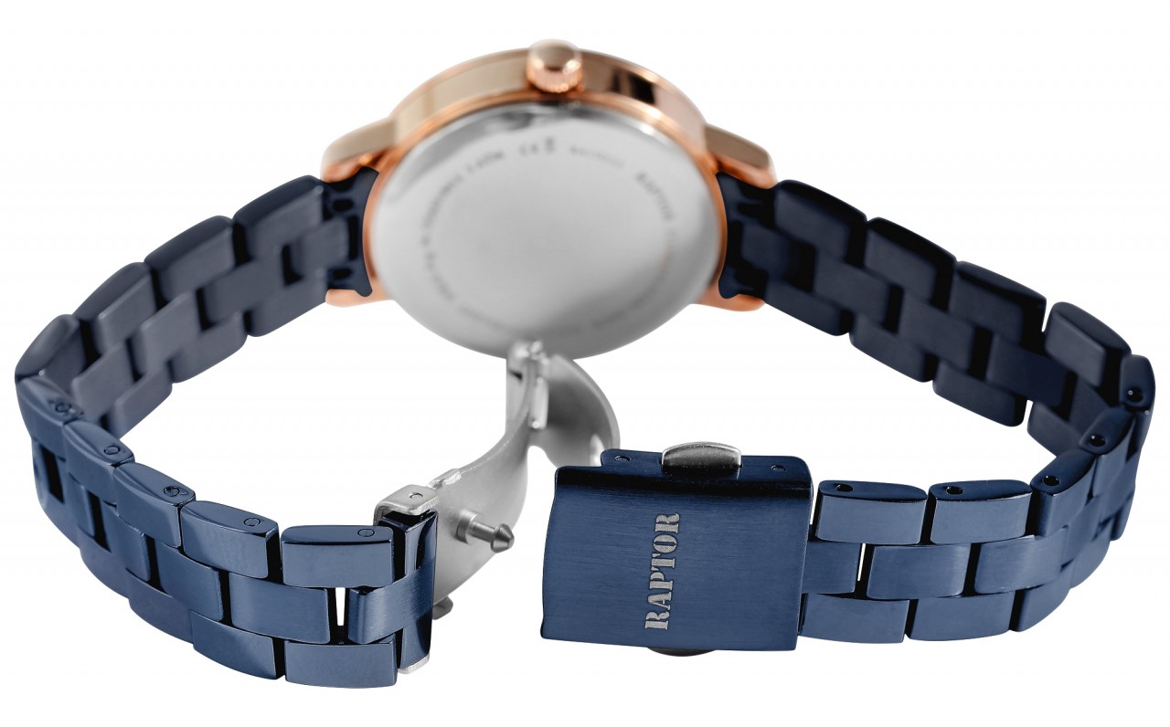 O relógio de pulso analógico de 3 ponteiros para senhora da marca Raptor possui um movimento de quartzo de alta qualidade. A bracelete em aço inoxidável tem uma largura de 12 mm e pode ser aberta e fechada com um fecho desdobrável. O comprimento total do relógio é de 18 cm. A caixa metálica com vidro mineral tem um diâmetro de 29 mm e uma altura de 10 mm. O fundo da caixa é feito de aço inoxidável e o relógio tem uma resistência à água de 3 bar. O mostrador é feito de madrepérola e brilha em todas as suas facetas. Os ponteiros e os índices são da mesma cor que a caixa, completando o aspeto geral harmonioso do relógio. Receberá um cartão de garantia e uma caixa original Raptor como acessórios do seu produto.