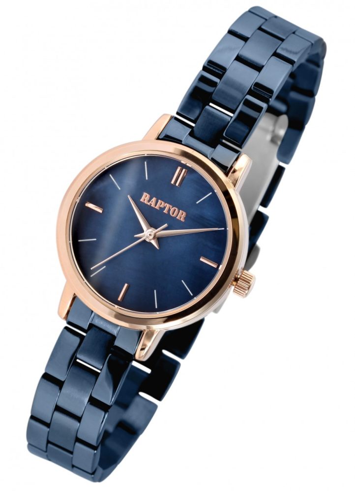 O relógio de pulso analógico de 3 ponteiros para senhora da marca Raptor possui um movimento de quartzo de alta qualidade. A bracelete em aço inoxidável tem uma largura de 12 mm e pode ser aberta e fechada com um fecho desdobrável. O comprimento total do relógio é de 18 cm. A caixa metálica com vidro mineral tem um diâmetro de 29 mm e uma altura de 10 mm. O fundo da caixa é feito de aço inoxidável e o relógio tem uma resistência à água de 3 bar. O mostrador é feito de madrepérola e brilha em todas as suas facetas. Os ponteiros e os índices são da mesma cor que a caixa, completando o aspeto geral harmonioso do relógio. Receberá um cartão de garantia e uma caixa original Raptor como acessórios do seu produto.