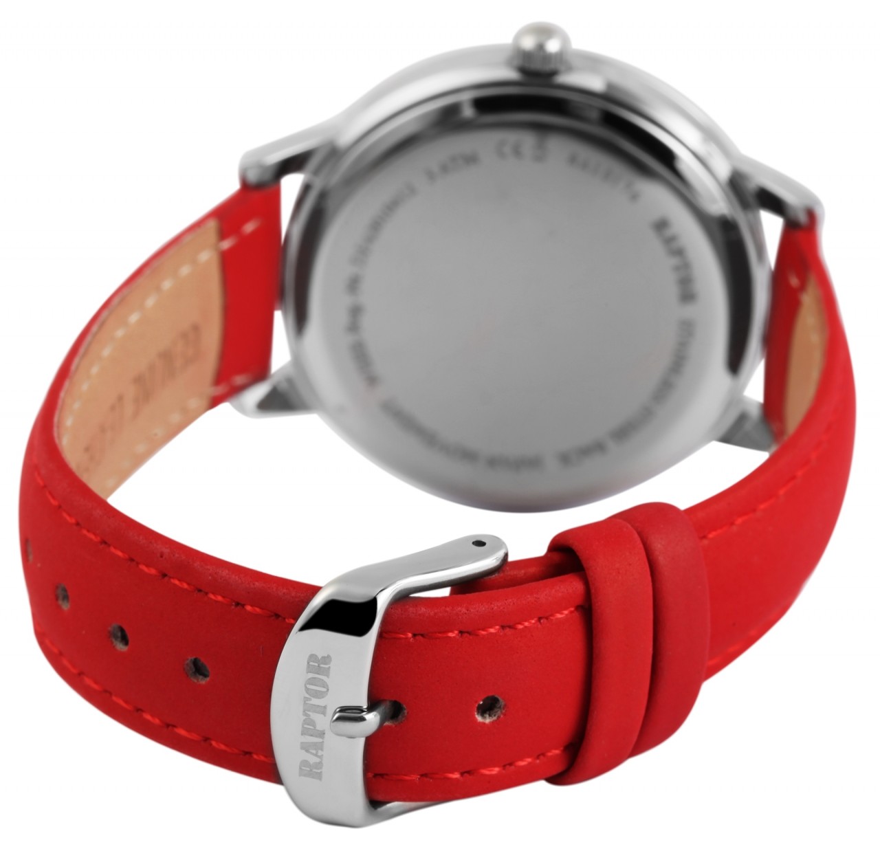 O relógio de pulso analógico de 3 ponteiros para senhora da marca Raptor possui um movimento de quartzo de alta qualidade. A bracelete em pele genuína tem 18 mm de largura na extremidade e pode ser aberta e fechada com uma fivela em aço inoxidável. O comprimento total do relógio é de 24 cm. A caixa metálica com vidro mineral tem um diâmetro de 40 mm e uma altura de 8 mm. O fundo da caixa é feito de aço inoxidável e o relógio tem uma resistência à água de 3 bar. O mostrador é monocromático e combina bem com o aspeto geral do relógio. Os ponteiros e os números são da mesma cor que a caixa e completam o…