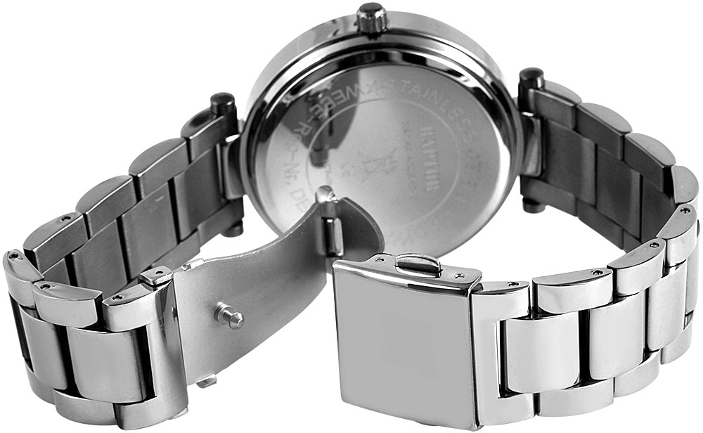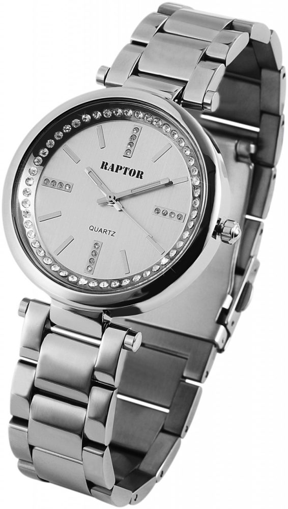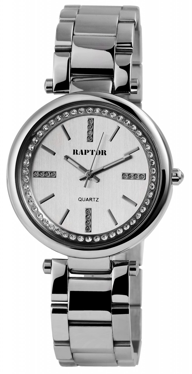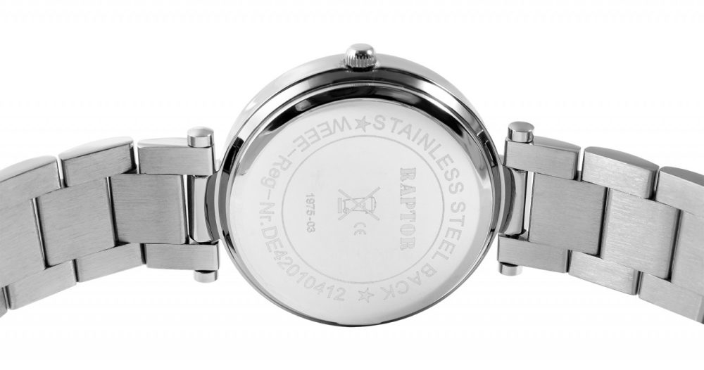 O relógio de senhora analógico da marca Raptor possui um movimento de quartzo de alta qualidade. A designação do modelo é RA202. A bracelete em aço inoxidável tem 18 mm de largura e abre-se com um fecho desdobrável em aço inoxidável. O comprimento total é de 19 cm. A caixa metálica com vidro mineral mede 38 mm e tem 12 mm de altura. A tampa da caixa é feita de aço inoxidável. O friso Simili no mostrador é também um destaque visual. Receberá os seguintes acessórios com o seu produto: cartão de garantia, caixa original