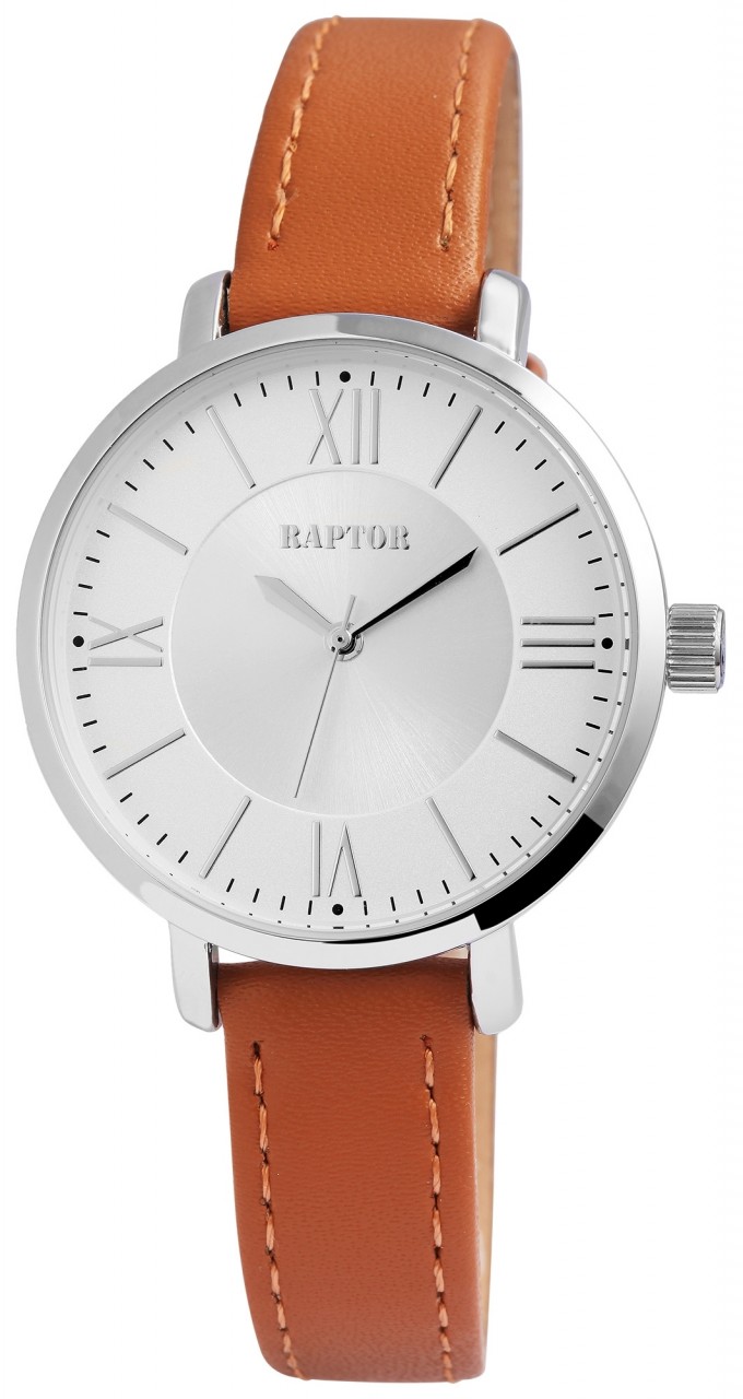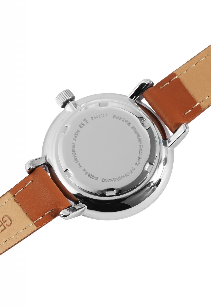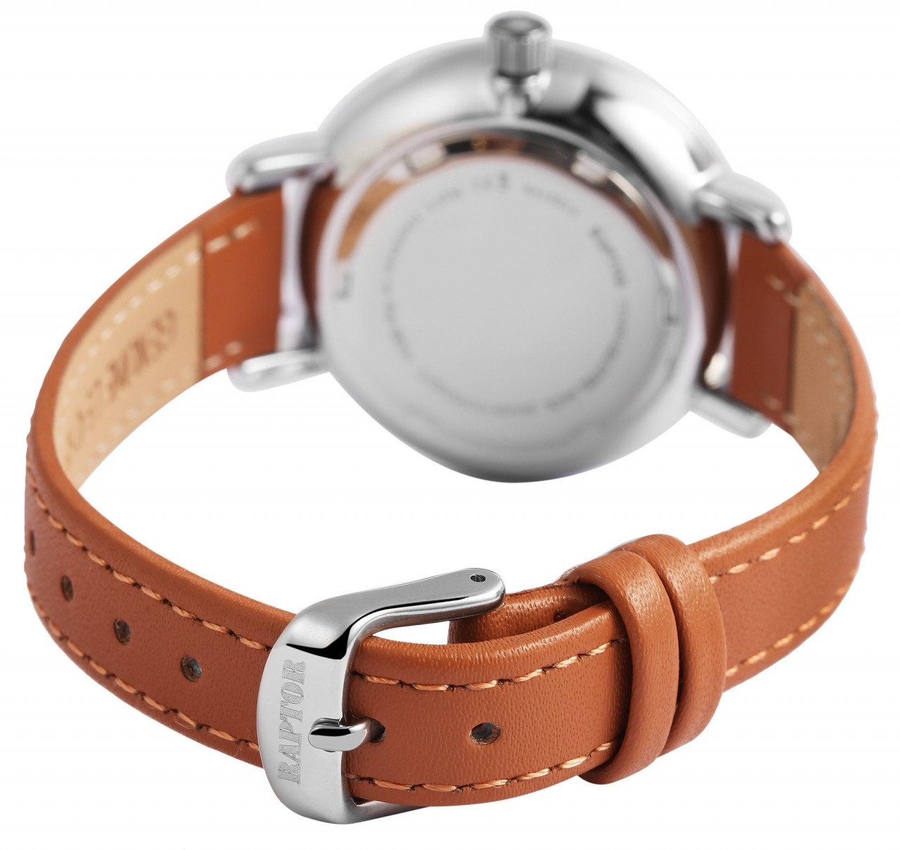 O relógio analógico de senhora da marca Raptor possui um movimento Miyota 2035. A bracelete em pele genuína tem 14 mm de largura e abre-se com uma fivela de pino em aço inoxidável. O comprimento total é de 22,5 cm. A caixa metálica com vidro mineral tem um diâmetro de 36 mm e uma altura de 9 mm. A tampa da caixa é feita de aço inoxidável. Receberá os seguintes acessórios com o seu produto: cartão de garantia, caixa original e manual de instruções.