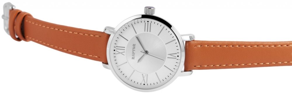 O relógio analógico de senhora da marca Raptor possui um movimento Miyota 2035. A bracelete em pele genuína tem 14 mm de largura e abre-se com uma fivela de pino em aço inoxidável. O comprimento total é de 22,5 cm. A caixa metálica com vidro mineral tem um diâmetro de 36 mm e uma altura de 9 mm. A tampa da caixa é feita de aço inoxidável. Receberá os seguintes acessórios com o seu produto: cartão de garantia, caixa original e manual de instruções.