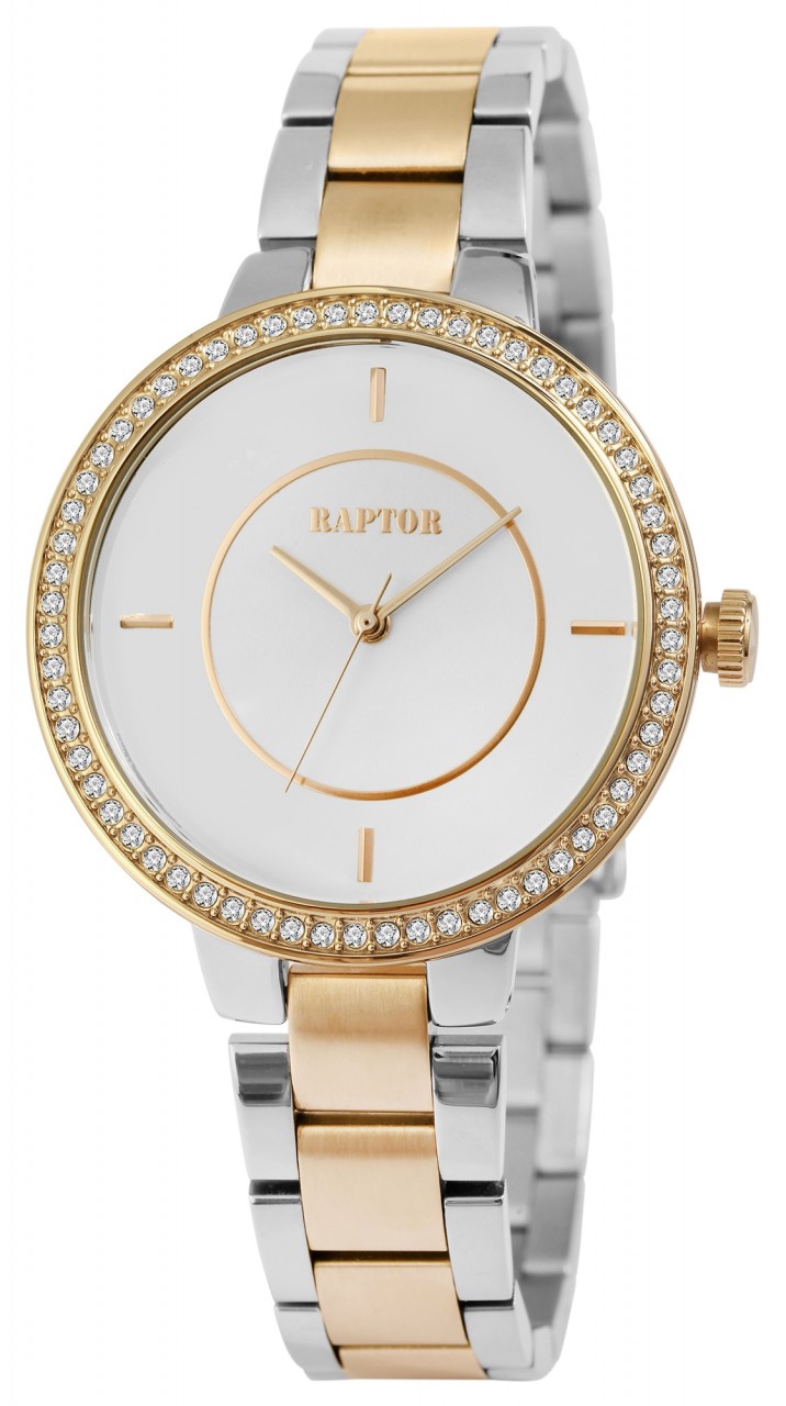 O relógio de pulso analógico de 3 ponteiros para senhora da marca Raptor possui um movimento de quartzo de alta qualidade. A bracelete em aço inoxidável tem 16 mm de largura na extremidade e pode ser aberta e fechada com um fecho desdobrável. O comprimento total do relógio é de 21,5 cm, mas pode ser ajustado conforme necessário graças aos elementos amovíveis. O diâmetro da caixa é de 37 mm e a altura da caixa é de 8 mm. A tampa da caixa também é feita de aço inoxidável. O relógio possui igualmente uma resistência à água de 3 bar. A bracelete em aço inoxidável brilhante forma uma transição suave para a caixa do relógio, completando o aspeto geral. Outra caraterística especial é a luneta decorada com pedras semelhantes. Os ponteiros e os índices condizem com a cor da caixa do relógio. O seu produto é fornecido com um cartão de garantia e uma caixa original Raptor.
