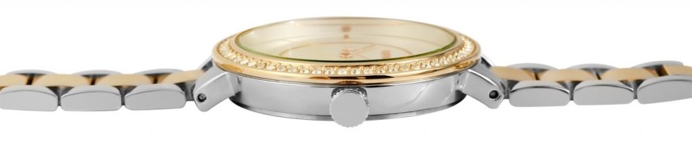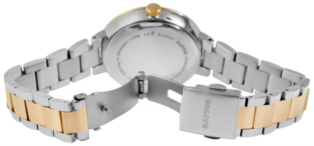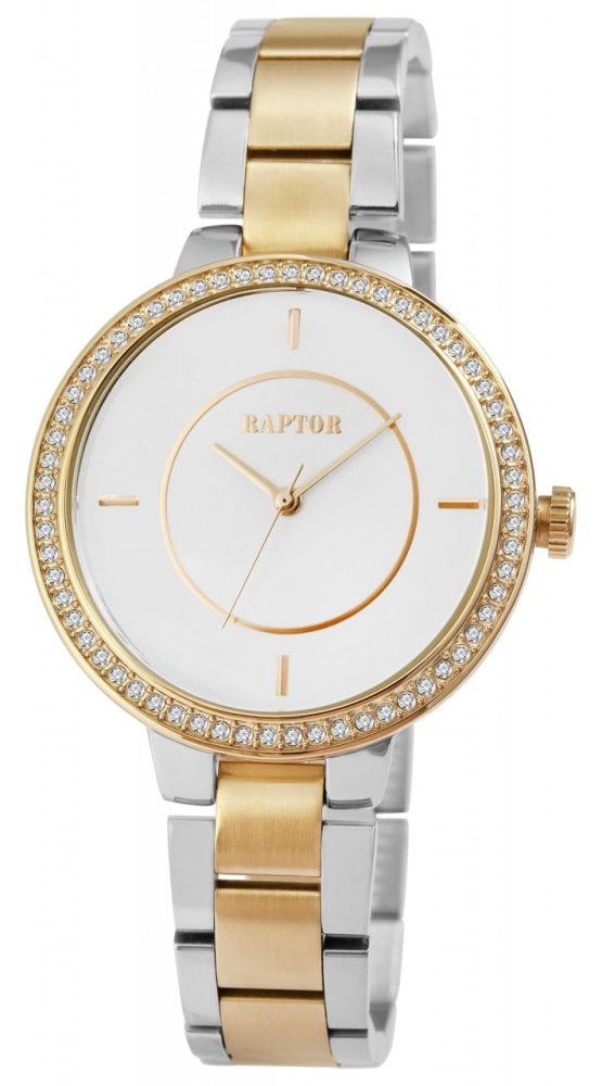 O relógio de pulso analógico de 3 ponteiros para senhora da marca Raptor possui um movimento de quartzo de alta qualidade. A bracelete em aço inoxidável tem 16 mm de largura na extremidade e pode ser aberta e fechada com um fecho desdobrável. O comprimento total do relógio é de 21,5 cm, mas pode ser ajustado conforme necessário graças aos elementos amovíveis. O diâmetro da caixa é de 37 mm e a altura da caixa é de 8 mm. A tampa da caixa também é feita de aço inoxidável. O relógio possui igualmente uma resistência à água de 3 bar. A bracelete em aço inoxidável brilhante forma uma transição suave para a caixa do relógio, completando o aspeto geral. Outra caraterística especial é a luneta decorada com pedras semelhantes. Os ponteiros e os índices condizem com a cor da caixa do relógio. O seu produto é fornecido com um cartão de garantia e uma caixa original Raptor.
