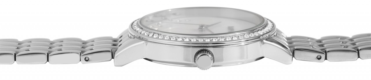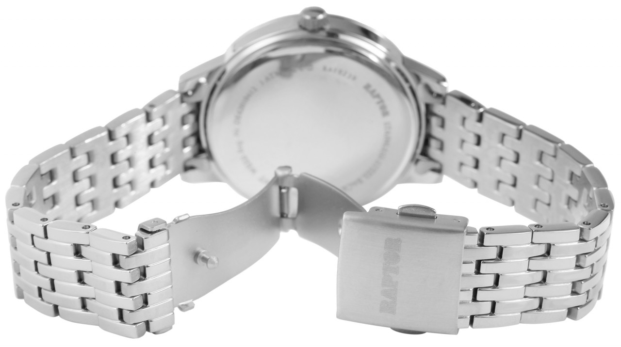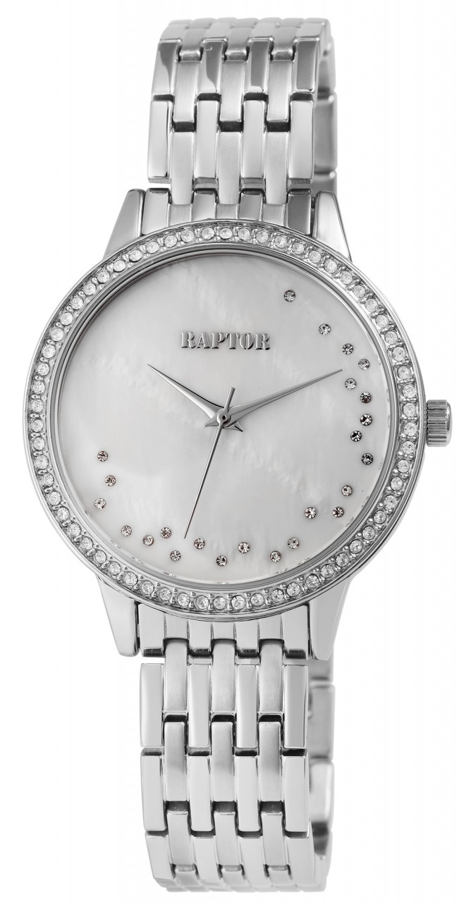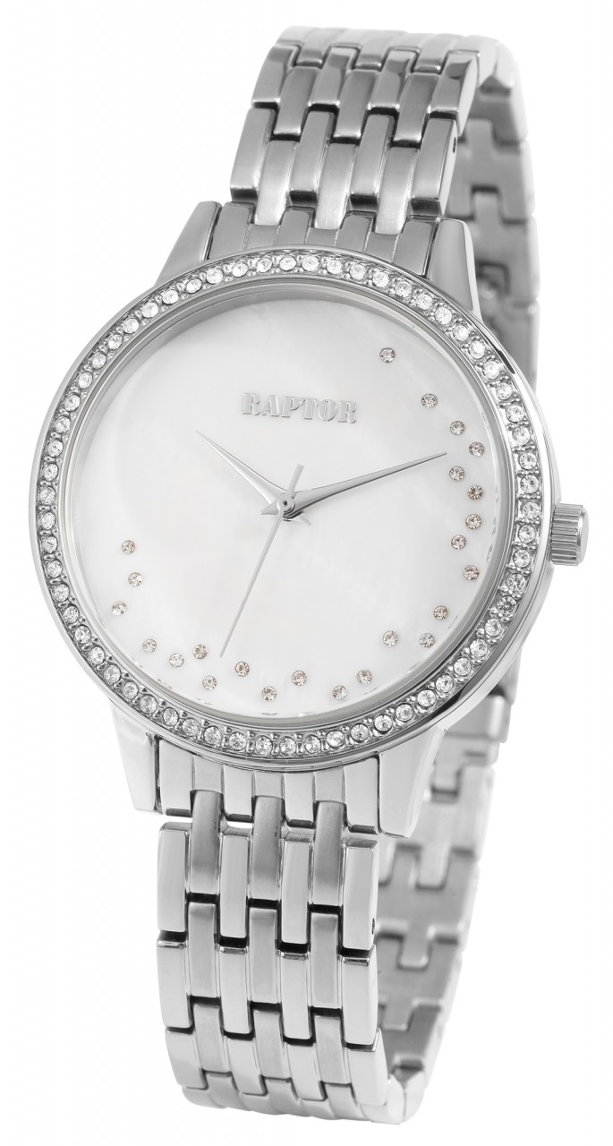 O relógio de pulso analógico de 3 ponteiros para senhora da marca Raptor possui um movimento de quartzo de alta qualidade. A bracelete em aço inoxidável tem 16 mm de largura na extremidade e pode ser aberta e fechada com um fecho desdobrável. O comprimento total do relógio é de 22 cm, mas pode ser ajustado conforme necessário graças aos elementos amovíveis. O diâmetro da caixa é de 38 mm e a altura da caixa é de 9 mm. A tampa da caixa também é feita de aço inoxidável. O relógio possui igualmente uma resistência à água de 3 bar. A bracelete em aço inoxidável brilhante forma uma transição suave para a caixa do relógio, completando o aspeto geral. Outra caraterística especial é a luneta decorada com pedras semelhantes e os pormenores no mostrador. Os ponteiros e os índices condizem com a cor da caixa do relógio. O seu produto é fornecido com um cartão de garantia e uma caixa original Raptor