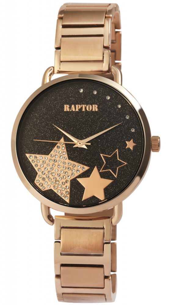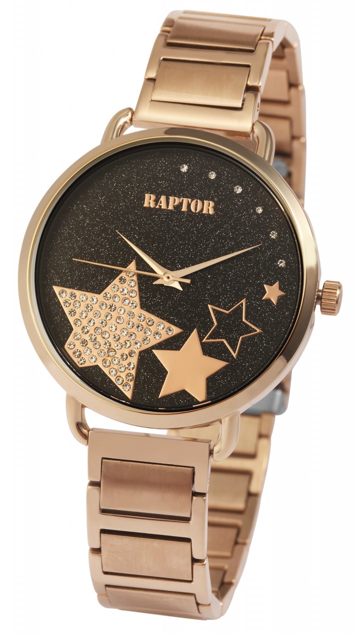 O relógio de pulso analógico de 3 ponteiros para senhora da marca Raptor possui um movimento de quartzo de alta qualidade. A bracelete em aço inoxidável tem 16 mm de largura na extremidade e pode ser aberta e fechada com um fecho desdobrável em aço inoxidável. O comprimento total do relógio é de 22 cm. A caixa metálica com vidro mineral tem um diâmetro de 39 mm e uma altura de 8 mm. O fundo da caixa é feito de aço inoxidável. O relógio tem também uma resistência à água de 3 bar. O mostrador ocupa o lugar central no relógio de senhora. Este é habilmente realçado pelos motivos em estrela e faz brilhar cada pulso. Receberá um cartão de garantia e uma caixa original Raptor como acessórios para o seu produto.