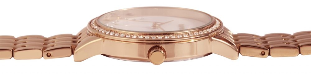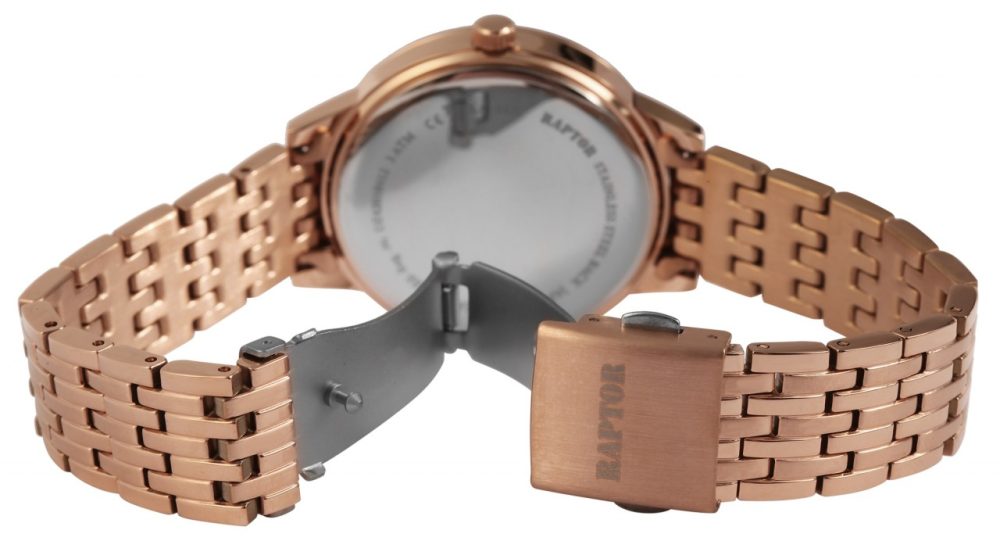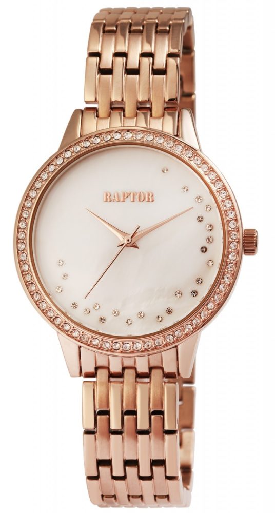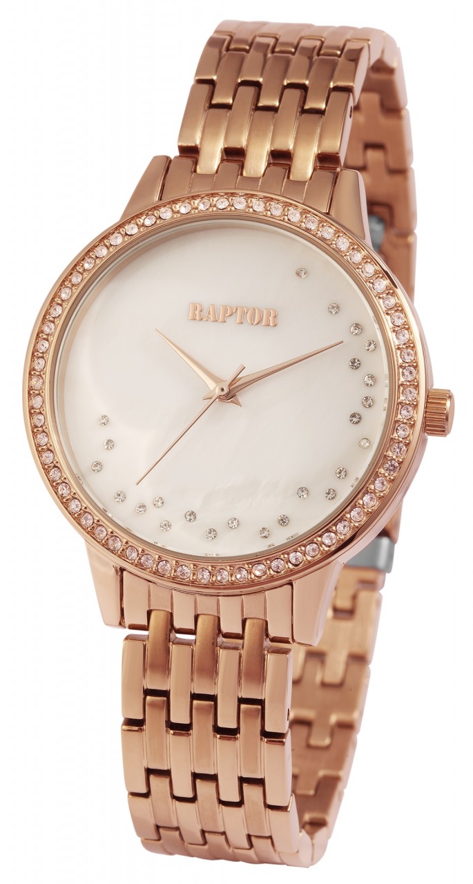 O relógio de pulso analógico de 3 ponteiros para senhora da marca Raptor possui um movimento de quartzo de alta qualidade. A bracelete em aço inoxidável tem 16 mm de largura na extremidade e pode ser aberta e fechada com um fecho desdobrável. O comprimento total do relógio é de 22 cm, mas pode ser ajustado conforme necessário graças aos elementos amovíveis. O diâmetro da caixa é de 38 mm e a altura da caixa é de 9 mm. A tampa da caixa também é feita de aço inoxidável. O relógio possui igualmente uma resistência à água de 3 bar. A bracelete em aço inoxidável brilhante forma uma transição suave para a caixa do relógio, completando o aspeto geral. Outra caraterística especial é a luneta decorada com pedras semelhantes e os pormenores no mostrador. Os ponteiros e os índices condizem com a cor da caixa do relógio. O seu produto é fornecido com um cartão de garantia e uma caixa original Raptor.