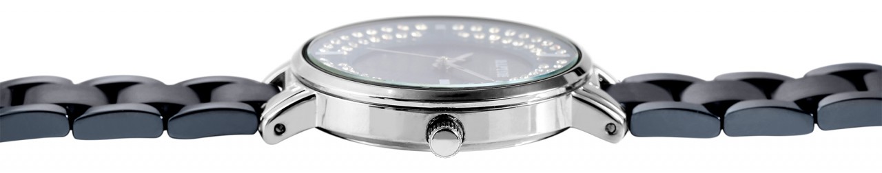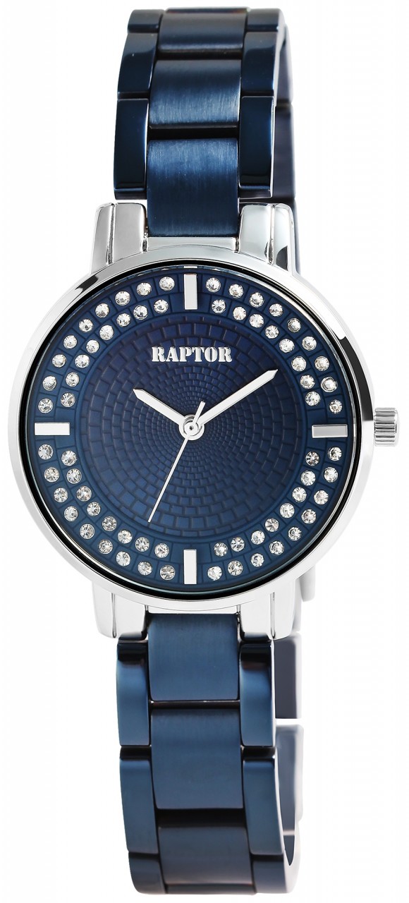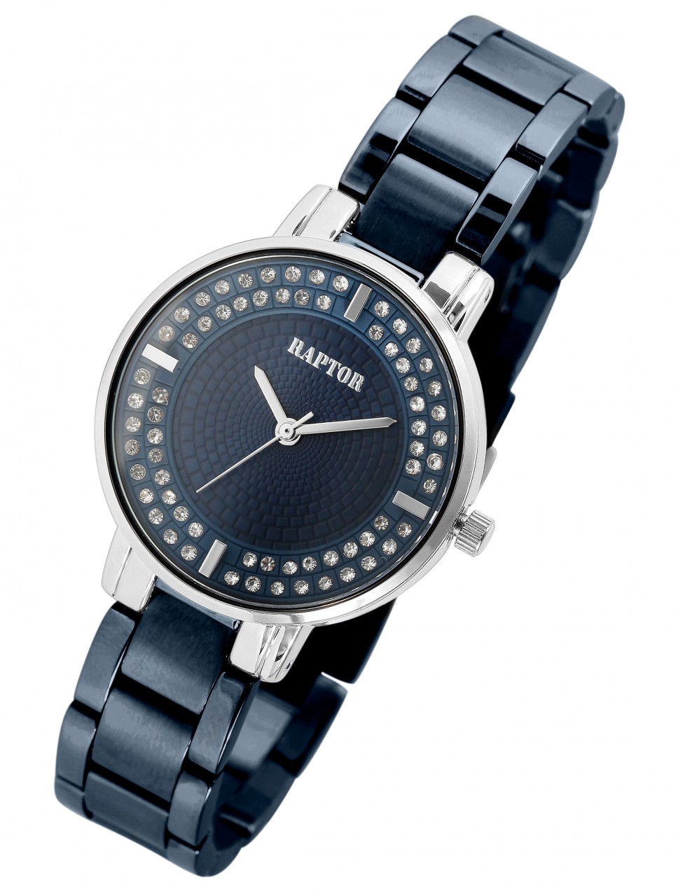 O relógio de pulso analógico de 3 ponteiros para senhora da marca Raptor possui um movimento de quartzo de alta qualidade. A bracelete em aço inoxidável tem uma largura de 16 mm e pode ser aberta e fechada com um fecho desdobrável. O comprimento total do relógio é de 18 cm. A caixa metálica com vidro mineral tem um diâmetro de 32 mm e uma altura de 6 mm. O que mais chama a atenção neste modelo de senhora é o mostrador cravejado de pedras semelhantes. Estas servem de índices de pontos e estão dispostas em duas filas. Os ponteiros e os índices condizem com a cor da caixa do relógio, completando harmoniosamente o aspeto geral. O fundo da caixa é feito de aço inoxidável e o relógio tem uma resistência à água de 3 bar. Receberá um cartão de garantia e uma caixa original Raptor como acessórios para o seu produto.