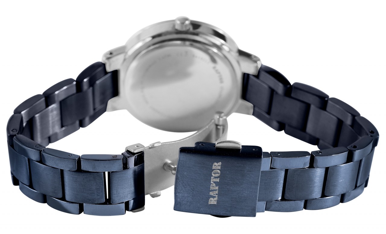 O relógio de pulso analógico de 3 ponteiros para senhora da marca Raptor possui um movimento de quartzo de alta qualidade. A bracelete em aço inoxidável tem uma largura de 16 mm e pode ser aberta e fechada com um fecho desdobrável. O comprimento total do relógio é de 18 cm. A caixa metálica com vidro mineral tem um diâmetro de 32 mm e uma altura de 6 mm. O que mais chama a atenção neste modelo de senhora é o mostrador cravejado de pedras semelhantes. Estas servem de índices de pontos e estão dispostas em duas filas. Os ponteiros e os índices condizem com a cor da caixa do relógio, completando harmoniosamente o aspeto geral. O fundo da caixa…