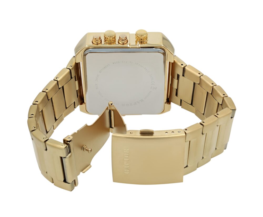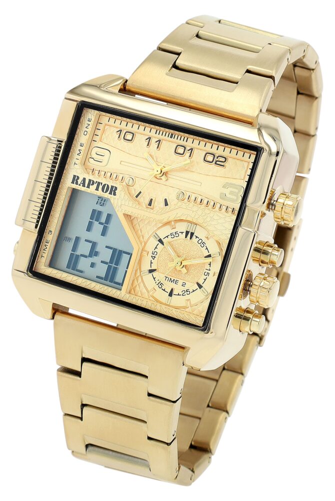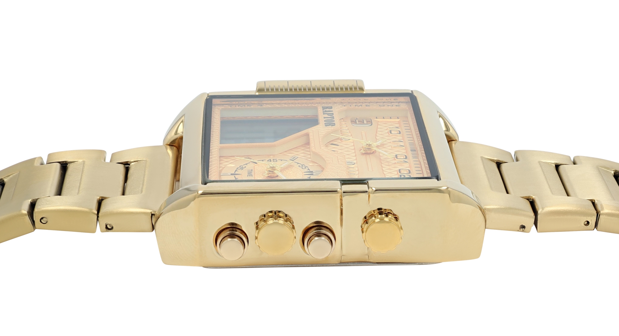 É um relógio inovador com uma caixa quadrada com variações de cores e aparência moderna. O mostrador possui um mostrador com 46 mm de largura e 42,5 mm de altura, o relógio marca uma presença poderosa no pulso. A pulseira em aço inoxidável tem 26 mm de largura e fecho dobrável seguro. Possui ainda uma combinação única de dois relógios analógicos e um digital com a capacidade de exibir três fusos horários.