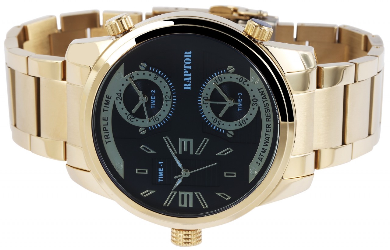 O relógio de pulso analógico masculino possui três movimentos de quartzo de alta qualidade da Miyota. A pulseira de elos é feita de aço inoxidável e tem 24 mm de largura . Fecha-se com um prático fecho dobrável em aço inoxidável que inclui uma barra de segurança. O mostrador possui um diâmetro de 47 mm e uma altura de 12 mm. A tampa da caixa é feita de aço inoxidável e o relógio tem resistência à água de 5 bar. Como acessórios do produto receberá um cartão de garantia e uma caixa original da marca Raptor.