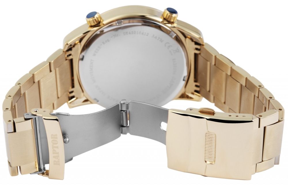 O relógio de pulso analógico masculino possui três movimentos de quartzo de alta qualidade da Miyota. A pulseira de elos é feita de aço inoxidável e tem 24 mm de largura . Fecha-se com um prático fecho dobrável em aço inoxidável que inclui uma barra de segurança. O mostrador possui um diâmetro de 47 mm e uma altura de 12 mm. A tampa da caixa é feita de aço inoxidável e o relógio tem resistência à água de 5 bar. Como acessórios do produto receberá um cartão de garantia e uma caixa original da marca Raptor.