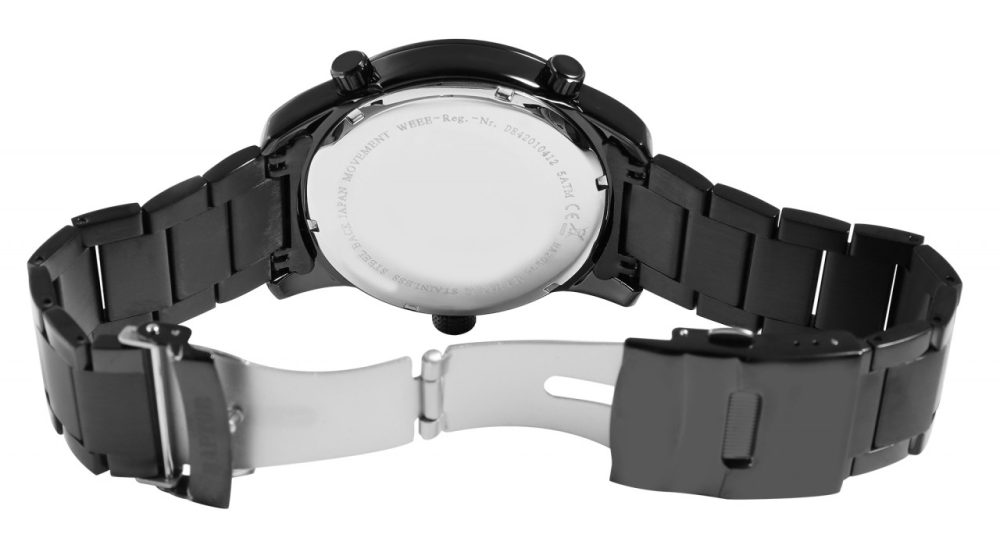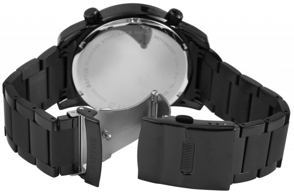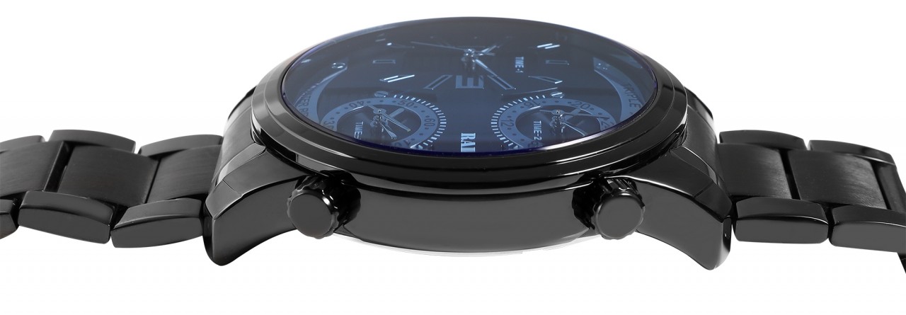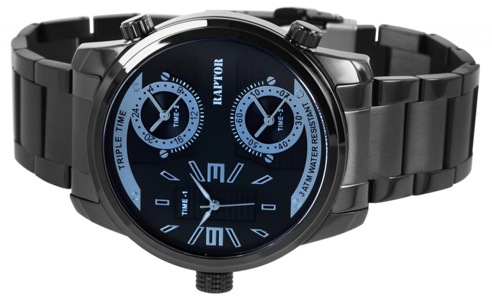 O relógio de pulso analógico masculino  possui três movimentos de quartzo de alta qualidade da Miyota. A pulseira de elos é feita de aço inoxidável e tem 24 mm de largura . Fecha-se com um prático fecho dobrável em aço inoxidável que inclui uma barra de segurança. O mostrador possui um diâmetro de 47 mm e uma altura de 12 mm. A tampa da caixa é feita de aço inoxidável e o relógio tem resistência à água de 5 bar. Como acessórios do produto receberá um cartão de garantia e uma caixa original da marca Raptor.
