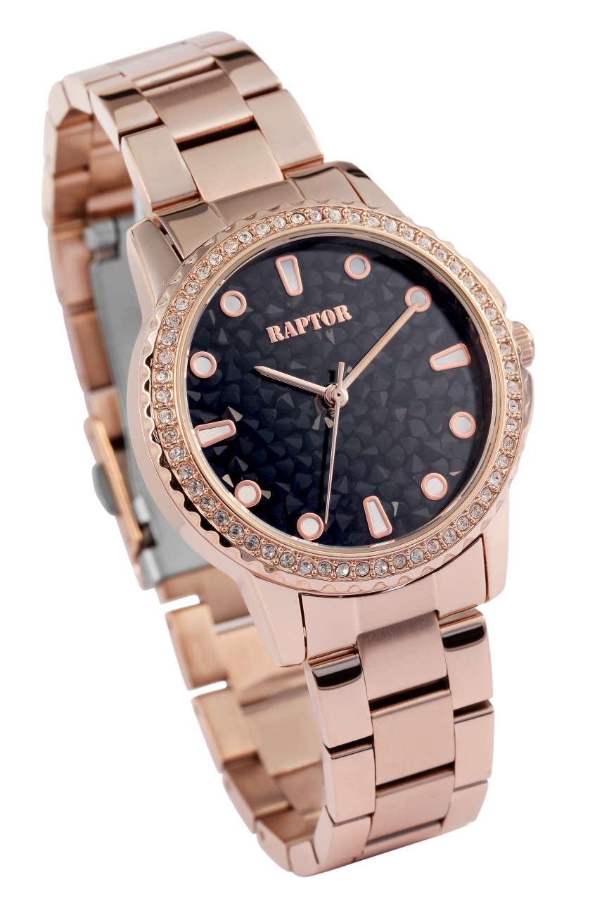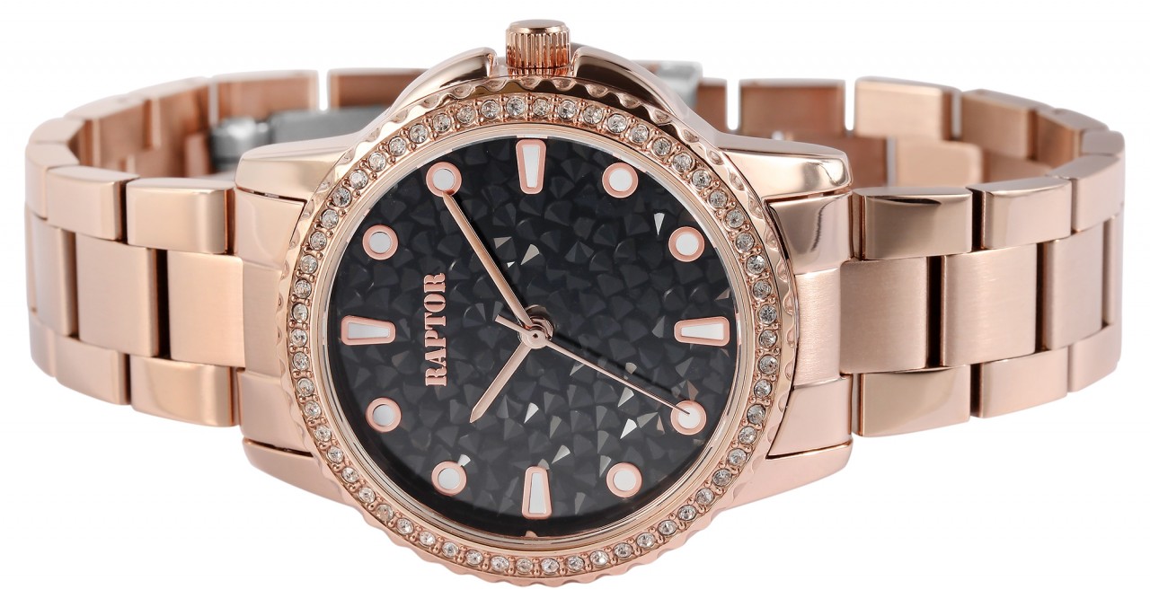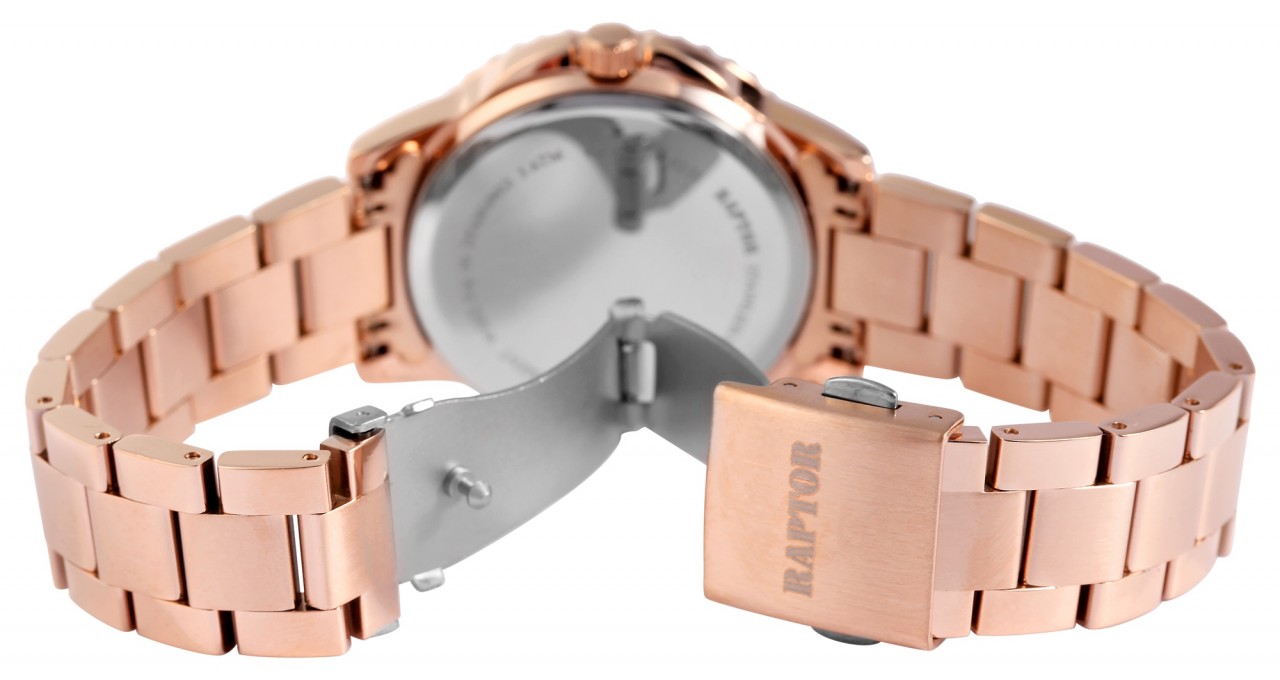 O relógio de pulso feminino analógico de 3 ponteiros da Raptor possui um movimento de quartzo de alta qualidade. A pulseira de aço inoxidável tem acabamento superficial fosco e polido. Tem 17 mm de largura na alça e pode ser aberto e fechado com um fecho dobrável em aço inoxidável. Devido aos elementos removíveis, o modelo do relógio pode ser encurtado conforme desejado. O comprimento total do relógio é de 21,5 cm e também é resistente à água até 3 bar. A caixa de metal com vidro mineral tem um diâmetro de 36 mm e uma altura de 11 mm. A parte traseira da caixa era feita de aço inoxidável. Outro destaque é o mostrador brilhante e a luneta marcante e símile, que dão os retoques finais e tornam este relógio um grande atrativo.