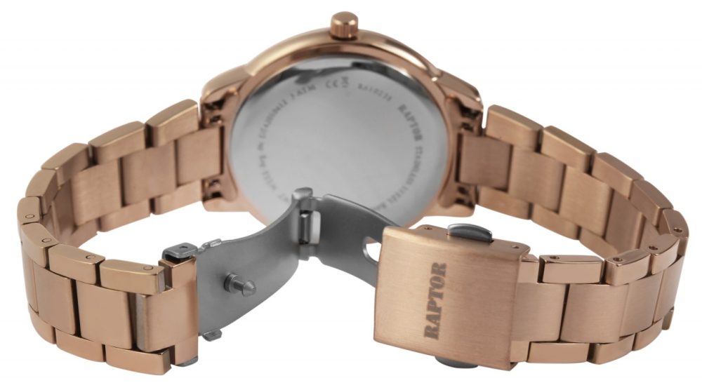 O relógio de pulso analógico de 3 ponteiros para senhora da marca Raptor possui um movimento de quartzo de alta qualidade. A bracelete em aço inoxidável tem 16 mm de largura na extremidade e pode ser aberta e fechada com um fecho desdobrável. O comprimento total do relógio é de 20,5 cm, mas pode ser ajustado conforme necessário graças aos elementos amovíveis. O diâmetro da caixa é de 35 mm e a altura da caixa é de 9,5 mm. A tampa da caixa também é feita de aço inoxidável. O relógio possui igualmente uma resistência à água de 3 bar. O foco deste relógio de senhora está no mostrador. Este é decorado com pedras Similis cintilantes que servem de índices…