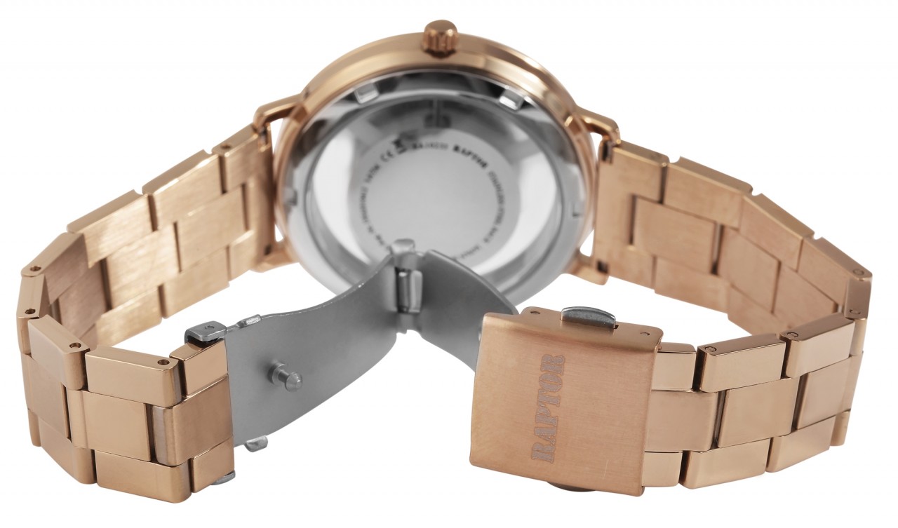 O relógio de pulso feminino analógico de 3 ponteiros da Raptor possui um movimento de quartzo de alta qualidade. A pulseira de aço inoxidável tem 18 mm de largura na alça e pode ser aberta e fechada com um fecho dobrável. O comprimento total do relógio é de 21,5 cm. A caixa de metal com vidro mineral tem um diâmetro de 38,5 mm e uma altura de 9 mm. O fundo da caixa é feito de uma borda estreita de aço inoxidável que contém um vidro mineral. Receberá um cartão de garantia e uma caixa original da marca Raptor.