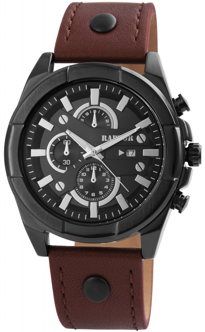 O relógio de pulso analógico masculino de 3 ponteiros da marca Raptor possui um movimento de quartzo de alta qualidade. A parte inferior da pulseira do relógio é feita de couro sintético e a parte superior é feita de couro genuíno. Tem 24 mm de largura na alça e pode ser aberto e fechado com uma fivela. O comprimento total do relógio é de 26 cm. A caixa de metal com moldura distinta e vidro mineral tem um diâmetro de 48 mm e uma altura de 12 mm. O modelo masculino também possui display de data às três horas. Além disso, o mostrador está equipado com um visual de cronógrafo, o que confere ao relógio moderno um visual esportivo. O fundo da caixa é feito de aço inoxidável e o relógio tem resistência à água de 3 bar. Os ponteiros revestidos com Superluminova facilitam a leitura das horas mesmo no escuro. Como acessório do seu produto você receberá um cartão de garantia…