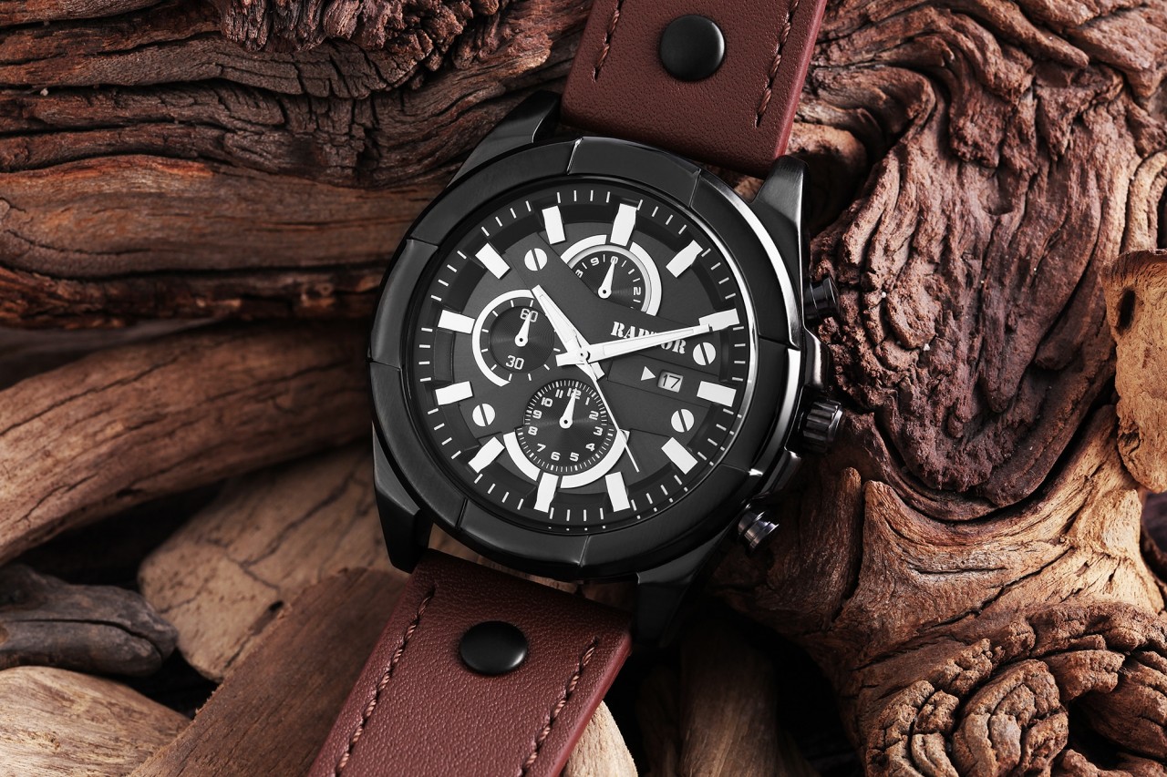 O relógio de pulso analógico masculino de 3 ponteiros da marca Raptor possui um movimento de quartzo de alta qualidade. A parte inferior da pulseira do relógio é feita de couro sintético e a parte superior é feita de couro genuíno. Tem 24 mm de largura na alça e pode ser aberto e fechado com uma fivela. O comprimento total do relógio é de 26 cm. A caixa de metal com moldura distinta e vidro mineral tem um diâmetro de 48 mm e uma altura de 12 mm. O modelo masculino também possui display de data às três horas. Além disso, o mostrador está equipado com um visual de cronógrafo, o que confere ao relógio moderno…
