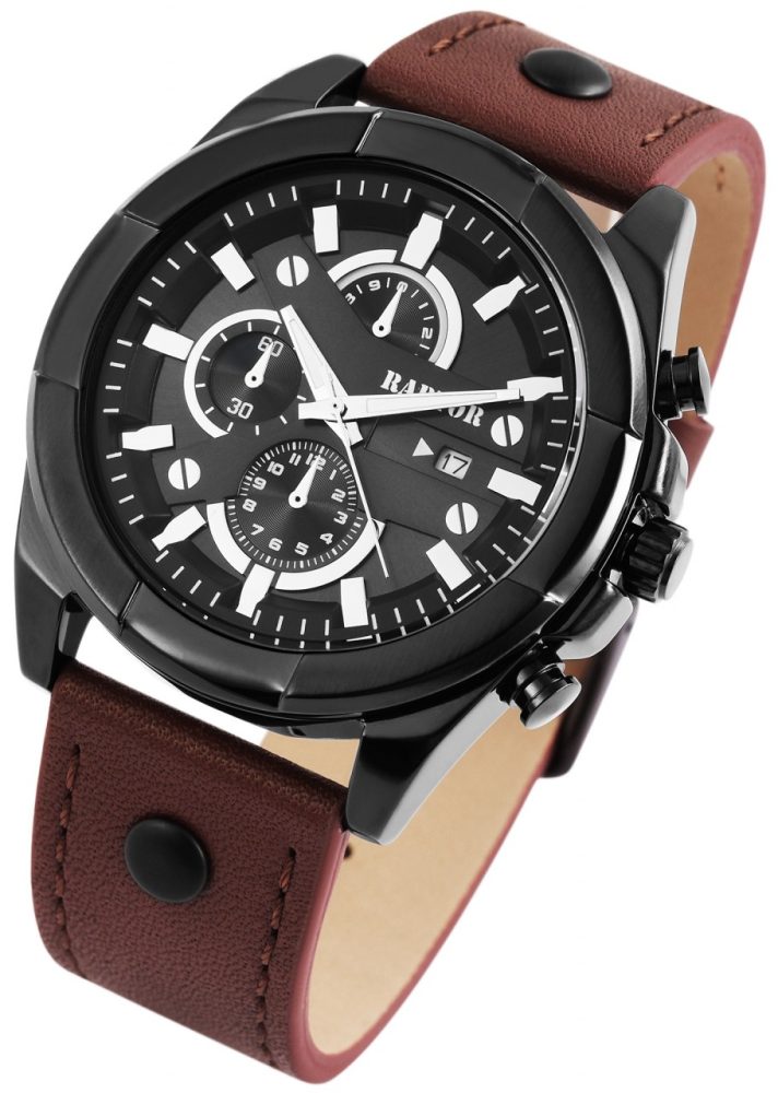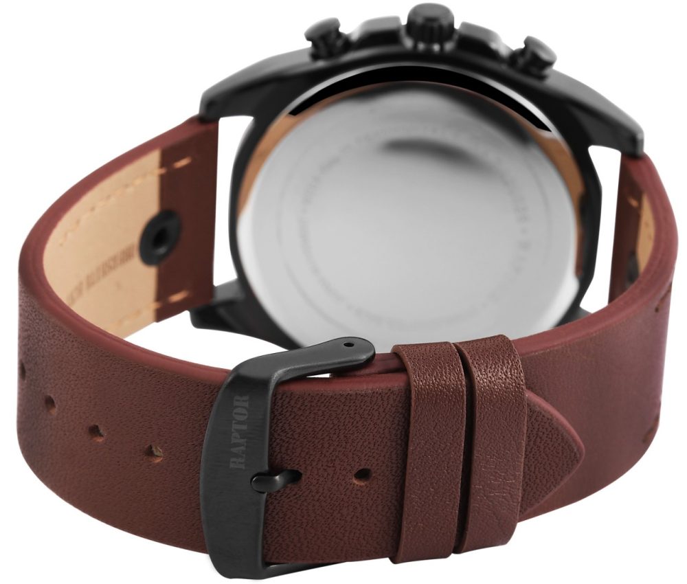O relógio de pulso analógico masculino de 3 ponteiros da marca Raptor possui um movimento de quartzo de alta qualidade. A parte inferior da pulseira do relógio é feita de couro sintético e a parte superior é feita de couro genuíno. Tem 24 mm de largura na alça e pode ser aberto e fechado com uma fivela. O comprimento total do relógio é de 26 cm. A caixa de metal com moldura distinta e vidro mineral tem um diâmetro de 48 mm e uma altura de 12 mm. O modelo masculino também possui display de data às três horas. Além disso, o mostrador está equipado com um visual de cronógrafo, o que confere ao relógio moderno…