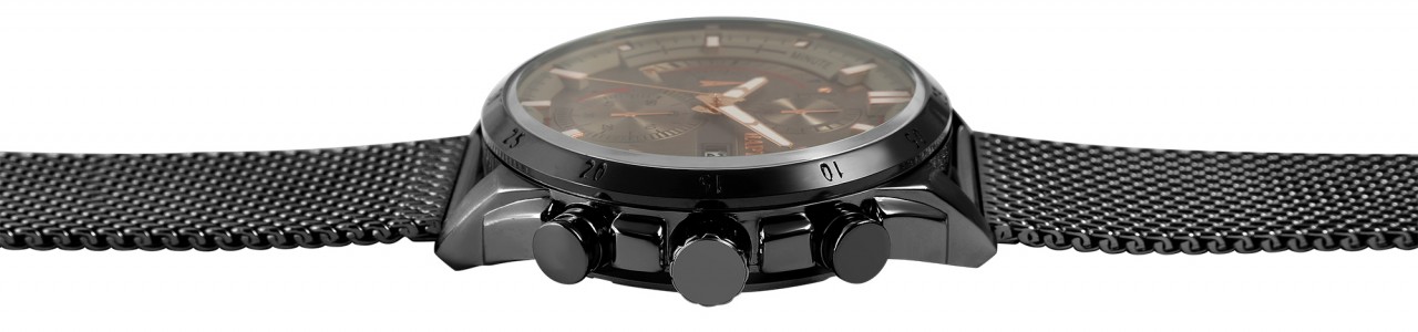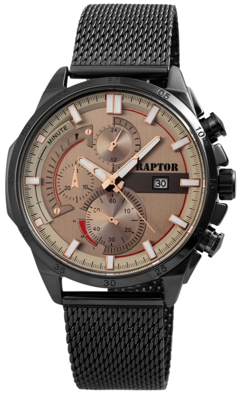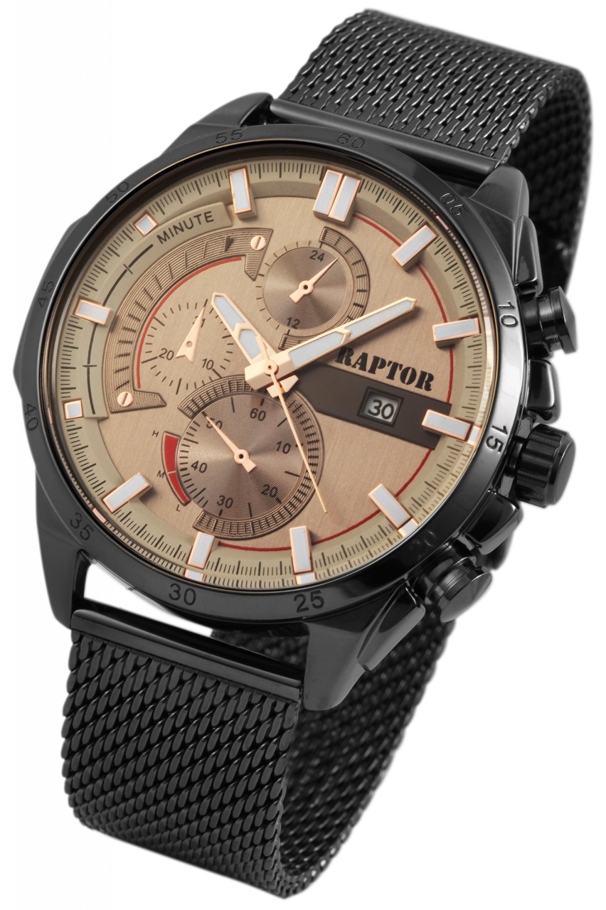 Bracelete tem 22 mm de largura; Pode ser fechado com um fecho de gancho em aço inoxidável. O comprimento total do relógio é de 24 cm. A caixa com vidro mineral com um diâmetro de 45 mm e uma altura de 13 mm. Mostrador equipado com um visual cronógrafo. Relógio com uma resistência de 3 ATM. Os ponteiros e índices revestidos com Superluminova facilitam a leitura das horas mesmo no escuro. Como acessórios do seu produto, você receberá um cartão de garantia e uma caixa original da marca Raptor.