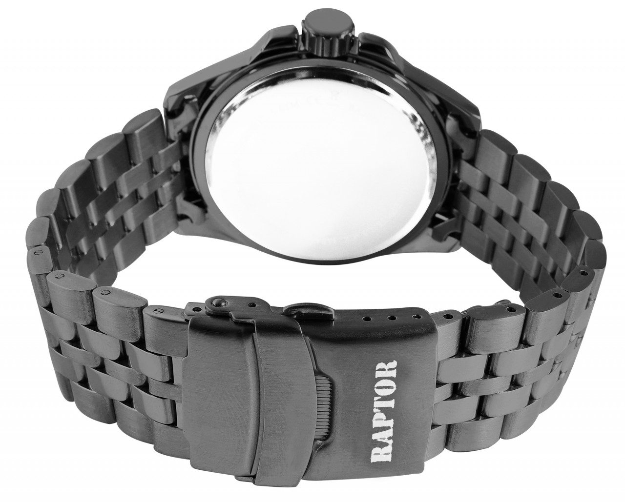 Descubra este relógio para homem da marca Raptor, bem como muitos outros relógios na nossa loja grossista de relógios, jóias e muito mais! O relógio Raptor para homem com bracelete de elos é uma sinfonia de materiais nobres e um design fascinante. Com um comprimento total de 23 cm e um impressionante diâmetro de caixa de 43 mm, é uma afirmação poderosa no pulso que não só garante uma cronometragem precisa, como também realça na perfeição o estilo pessoal dos seus clientes. A altura da caixa de 10 mm confere ao relógio uma presença impressionante, enquanto a largura da bracelete de 22 mm acentua o seu efeito elegante. A caixa metálica com vidro mineral e uma tampa da caixa em aço inoxidável não só protege contra influências externas, como também proporciona robustez e estabilidade adicionais.