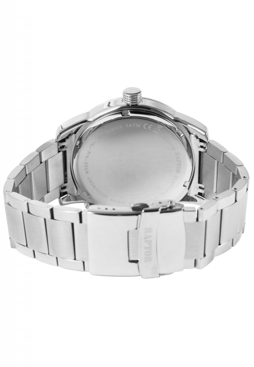 O relógio de pulso analógico de 3 ponteiros para homem da marca Raptor possui três movimentos de quartzo de alta qualidade da Miyota, uma vez que este relógio de homem moderno apresenta três fusos horários. A bracelete de elos é feita de aço inoxidável e tem 24 mm de largura na extremidade. É fixada com um prático fecho desdobrável em aço inoxidável, incluindo um fecho de segurança. O comprimento total do relógio é de 24,5 cm. A caixa redonda em metal com vidro mineral tem um diâmetro de 47 mm e uma altura de 12 mm. A tampa da caixa é feita de aço inoxidável e o relógio tem uma resistência à água de 5 bar. Receberá um cartão de garantia e uma caixa original Raptor como acessórios para o seu produto.