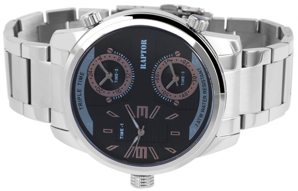 O relógio de pulso analógico de 3 ponteiros para homem da marca Raptor possui três movimentos de quartzo de alta qualidade da Miyota, uma vez que este relógio de homem moderno apresenta três fusos horários. A bracelete de elos é feita de aço inoxidável e tem 24 mm de largura na extremidade. É fixada com um prático fecho desdobrável em aço inoxidável, incluindo um fecho de segurança. O comprimento total do relógio é de 24,5 cm. A caixa redonda em metal com vidro mineral tem um diâmetro de 47 mm e uma altura de 12 mm. A tampa da caixa é feita de aço inoxidável e o relógio tem uma resistência à água de 5 bar. Receberá um cartão de garantia e uma caixa original Raptor como acessórios para o seu produto.