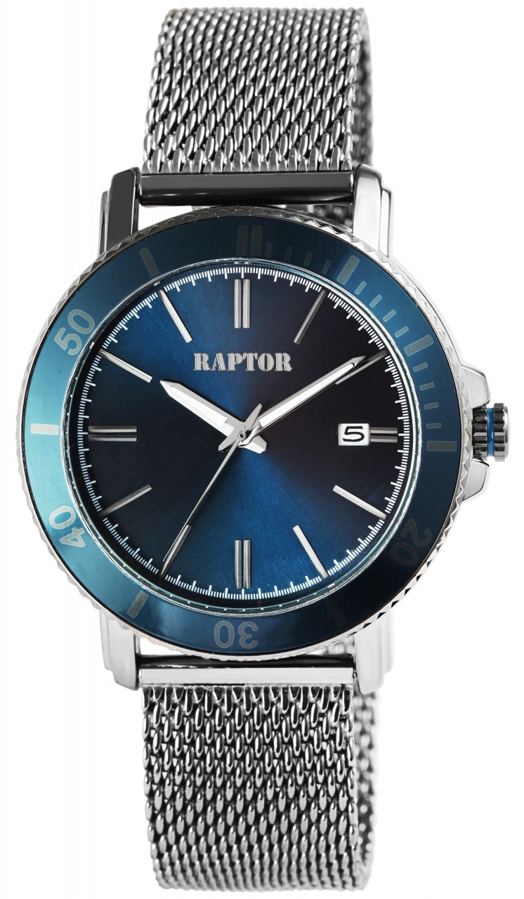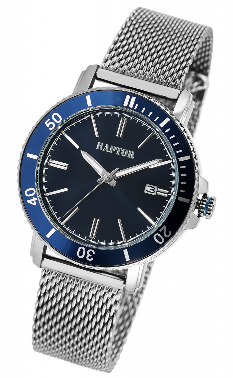 O relógio de pulso analógico de 3 ponteiros para homem da marca Raptor possui um movimento de quartzo de alta qualidade. A bracelete de malha fina é feita de aço inoxidável e tem uma largura de 20,5 mm. Pode ser aberta e fechada através de um fecho de gancho, que pode ser ajustado individualmente para que o comprimento da bracelete possa ser adaptado a qualquer circunferência do pulso. O comprimento total do relógio é de 24,5 cm. A caixa redonda do relógio com vidro mineral tem um diâmetro de 42 mm e uma altura de 11 mm. O relógio possui também uma indicação da data às três horas e uma resistência à água de 3 bar. Cada relógio Raptor é fornecido com um cartão de garantia e uma caixa original Raptor.