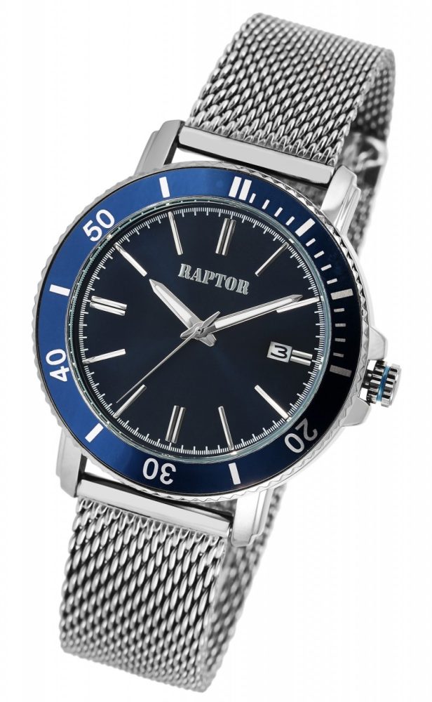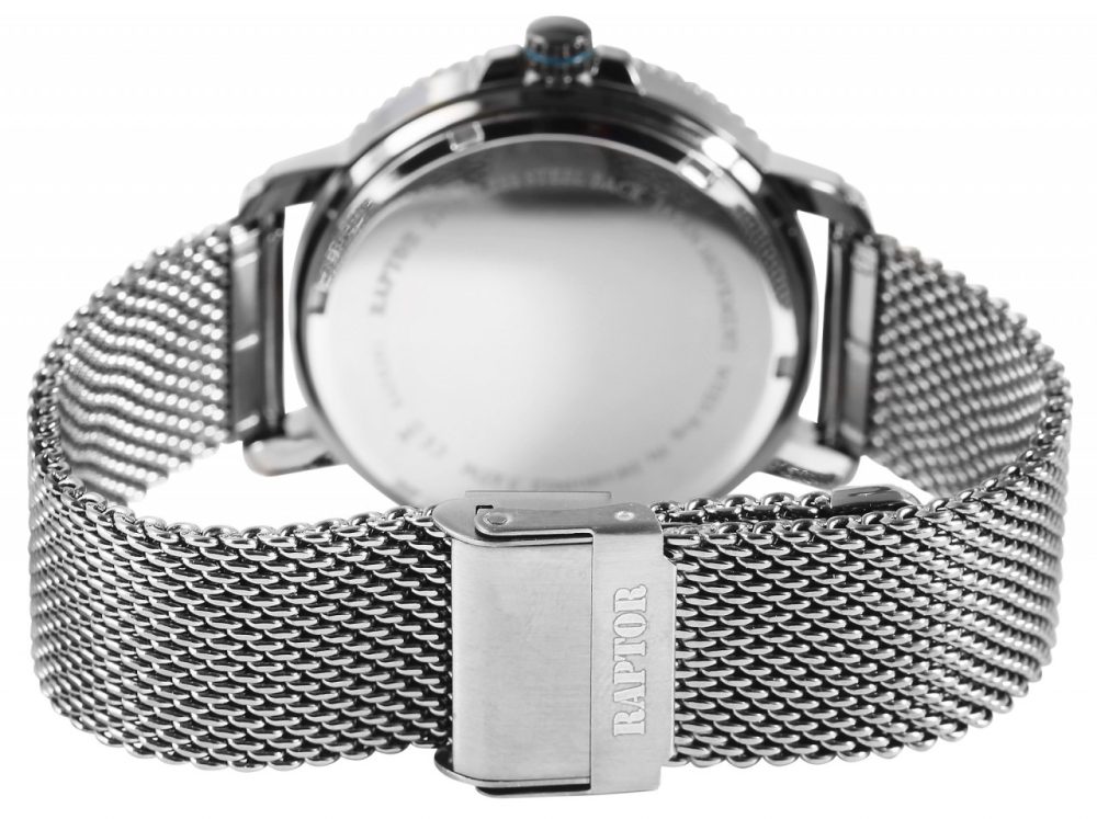 O relógio de pulso analógico de 3 ponteiros para homem da marca Raptor possui um movimento de quartzo de alta qualidade. A bracelete de malha fina é feita de aço inoxidável e tem uma largura de 20,5 mm. Pode ser aberta e fechada através de um fecho de gancho, que pode ser ajustado individualmente para que o comprimento da bracelete possa ser adaptado a qualquer circunferência do pulso. O comprimento total do relógio é de 24,5 cm. A caixa redonda do relógio com vidro mineral tem um diâmetro de 42 mm e uma altura de 11 mm. O relógio possui também uma indicação da data às três horas e uma resistência à água de 3 bar. Cada relógio Raptor é fornecido com um cartão de garantia e uma caixa original Raptor.