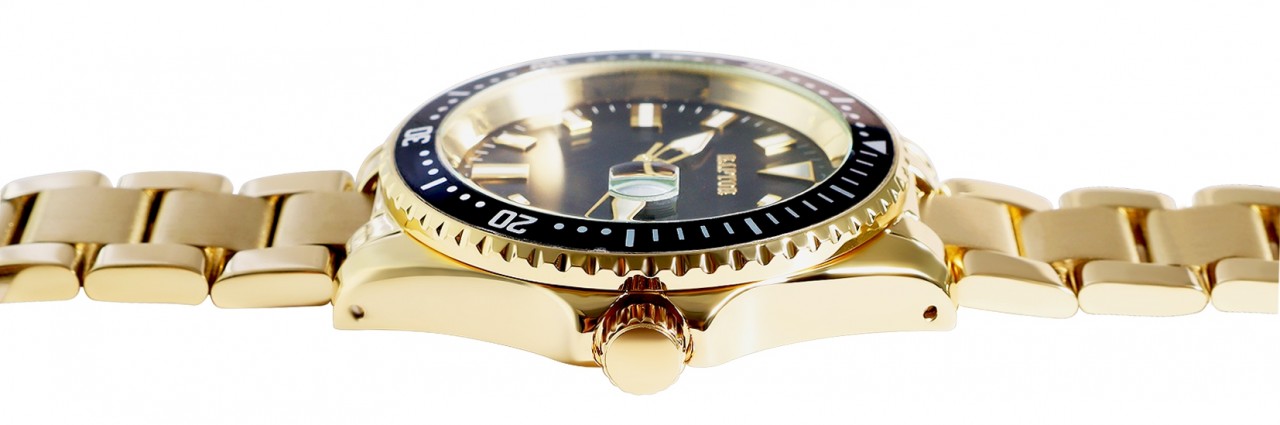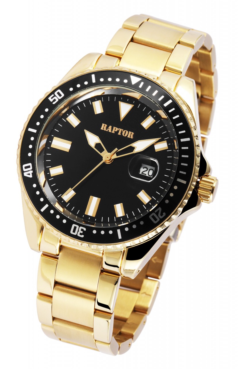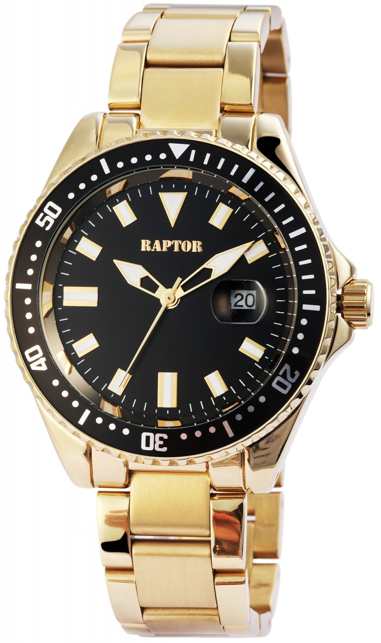O relógio de pulso analógico de 3 ponteiros para homem da marca Raptor possui um movimento de quartzo de alta qualidade. A bracelete de elos em aço inoxidável tem 20 mm de largura na extremidade e pode ser aberta e fechada com um fecho desdobrável em aço inoxidável. O comprimento total do relógio é de 22 cm. A caixa metálica com vidro mineral tem um diâmetro de 43 mm e uma altura de 11 mm. O relógio possui também uma indicação da data às três horas, que está adicionalmente equipada com uma lente de aumento no vidro. O fundo da caixa é feito de aço inoxidável e o relógio de homem é também resistente à água até 3 bar. Os ponteiros e índices revestidos a Superluminova facilitam a leitura das horas mesmo no escuro. Outro destaque deste relógio é a luneta rotativa, que acrescenta mais pormenores de moda ao modelo. Como acessórios para o seu produto, receberá um cartão de garantia e um relógio…