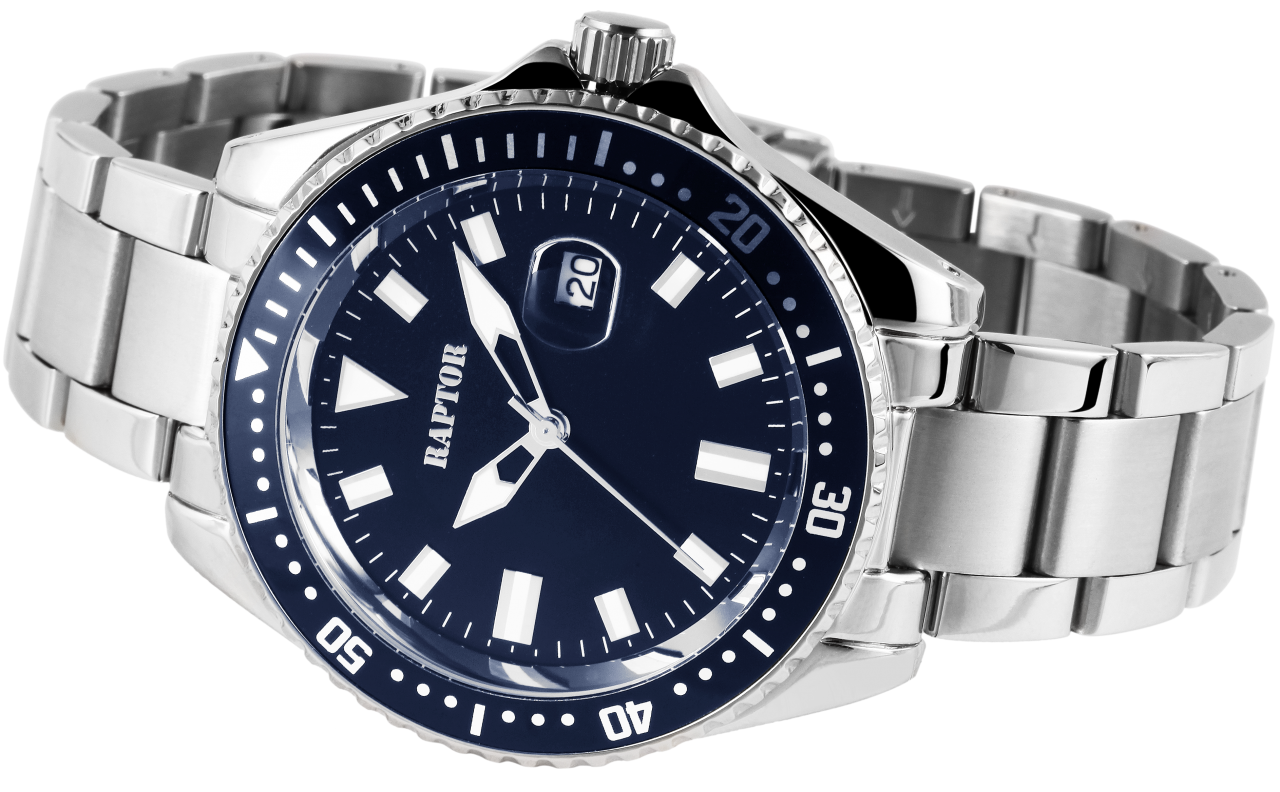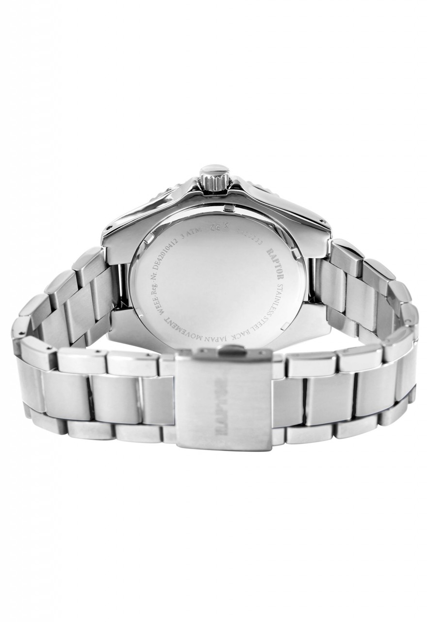 O relógio de pulso analógico de 3 ponteiros para homem da marca Raptor possui um movimento de quartzo de alta qualidade. A bracelete de elos em aço inoxidável tem 20 mm de largura na extremidade e pode ser aberta e fechada com um fecho desdobrável em aço inoxidável. O comprimento total do relógio é de 22 cm. A caixa metálica com vidro mineral tem um diâmetro de 43 mm e uma altura de 11 mm. O relógio possui também uma indicação da data às três horas, que está adicionalmente equipada com uma lente de aumento no vidro. O fundo da caixa é feito de aço inoxidável e o relógio de homem é também resistente à água até 3 bar. Os ponteiros e índices revestidos a Superluminova facilitam a leitura das horas mesmo no escuro. Outro destaque deste relógio é a luneta rotativa, que acrescenta mais pormenores de moda ao modelo. Como acessórios para o seu produto, receberá um cartão de garantia e um relógio…
