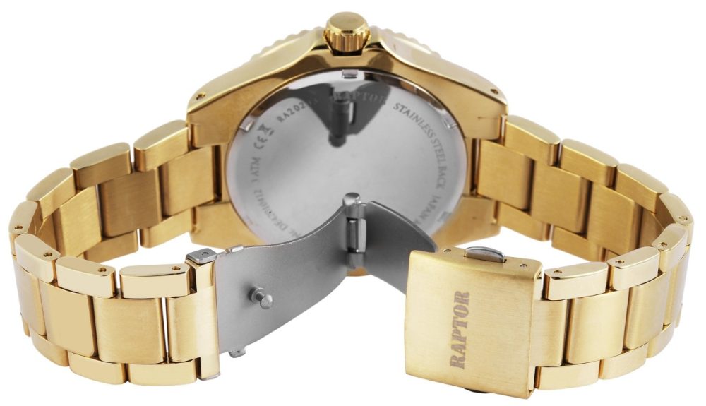 O relógio de pulso analógico de 3 ponteiros para homem da marca Raptor possui um movimento de quartzo de alta qualidade. A bracelete de elos em aço inoxidável tem 20 mm de largura na extremidade e pode ser aberta e fechada com um fecho desdobrável em aço inoxidável. O comprimento total do relógio é de 22 cm. A caixa metálica com vidro mineral tem um diâmetro de 43 mm e uma altura de 11 mm. O relógio possui também uma indicação da data às três horas, que está adicionalmente equipada com uma lente de aumento no vidro. O fundo da caixa é feito de aço inoxidável e o relógio de homem é também resistente à água até 3 bar. Os ponteiros e índices revestidos a Superluminova facilitam a leitura das horas mesmo no escuro. Outro destaque deste relógio é a luneta rotativa, que acrescenta mais pormenores de moda ao modelo. Como acessórios para o seu produto, receberá um cartão de garantia e um relógio…