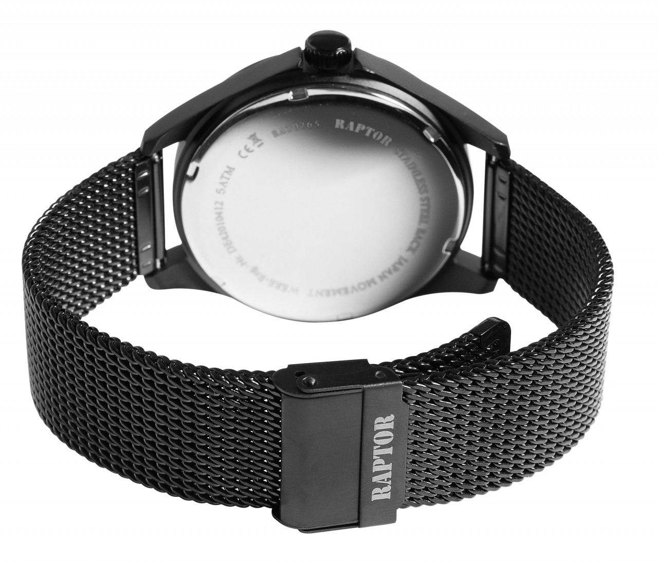 O relógio de pulso analógico de 3 ponteiros para homem da marca Raptor apresenta o movimento de quartzo de alta qualidade Japan VX43E411C. A bracelete milanesa é feita de aço inoxidável e tem 22 mm de largura na extremidade. Pode ser aberta e fechada com um fecho de gancho em aço inoxidável. O comprimento total do relógio é de 24 cm. A caixa metálica com vidro mineral tem um diâmetro de 46 mm e uma altura de 12 mm. O relógio possui também uma indicação do dia e da data. O fundo da caixa é feito de aço inoxidável e o relógio tem uma resistência à água de 3 bar. Receberá um cartão de garantia e uma caixa original Raptor…