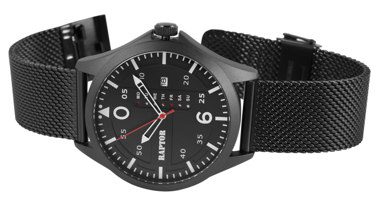 O relógio de pulso analógico de 3 ponteiros para homem da marca Raptor apresenta o movimento de quartzo de alta qualidade Japan VX43E411C. A bracelete milanesa é feita de aço inoxidável e tem 22 mm de largura na extremidade. Pode ser aberta e fechada com um fecho de gancho em aço inoxidável. O comprimento total do relógio é de 24 cm. A caixa metálica com vidro mineral tem um diâmetro de 46 mm e uma altura de 12 mm. O relógio possui também uma indicação do dia e da data. O fundo da caixa é feito de aço inoxidável e o relógio tem uma resistência à água de 3 bar. Receberá um cartão de garantia e uma caixa original Raptor como acessórios para o seu produto.