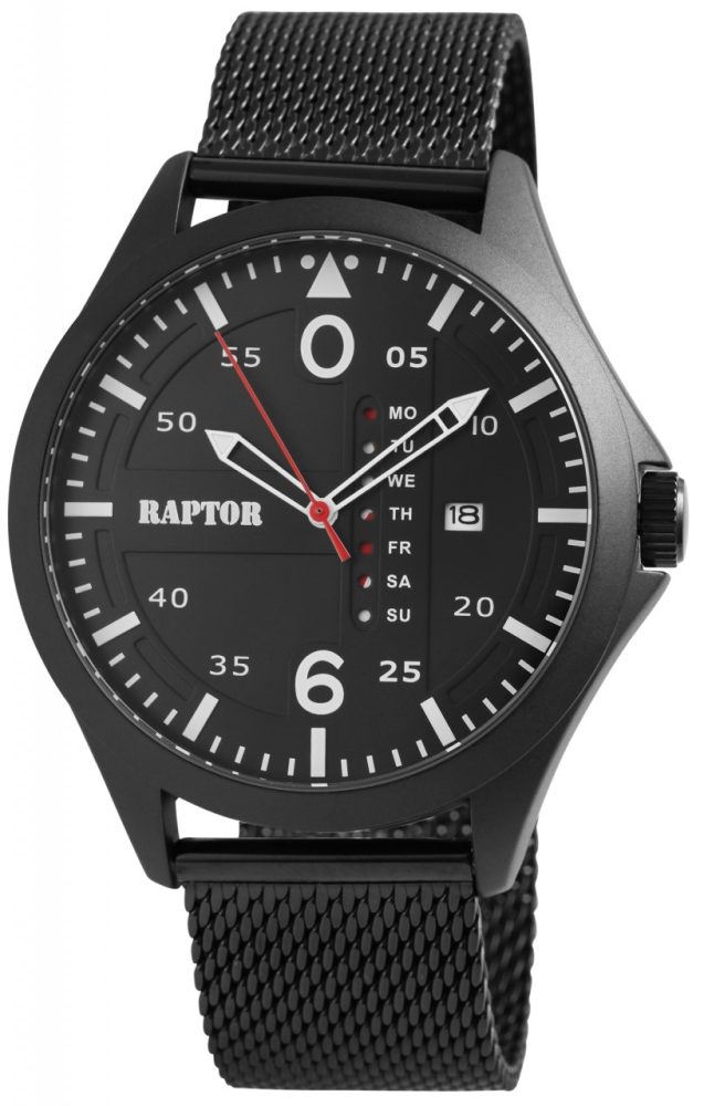 O relógio de pulso analógico de 3 ponteiros para homem da marca Raptor apresenta o movimento de quartzo de alta qualidade Japan VX43E411C. A bracelete milanesa é feita de aço inoxidável e tem 22 mm de largura na extremidade. Pode ser aberta e fechada com um fecho de gancho em aço inoxidável. O comprimento total do relógio é de 24 cm. A caixa metálica com vidro mineral tem um diâmetro de 46 mm e uma altura de 12 mm. O relógio possui também uma indicação do dia e da data. O fundo da caixa é feito de aço inoxidável e o relógio tem uma resistência à água de 3 bar. Receberá um cartão de garantia e uma caixa original Raptor…