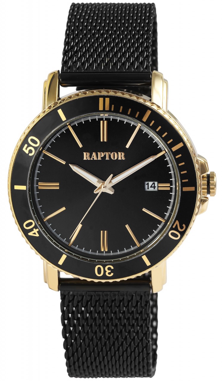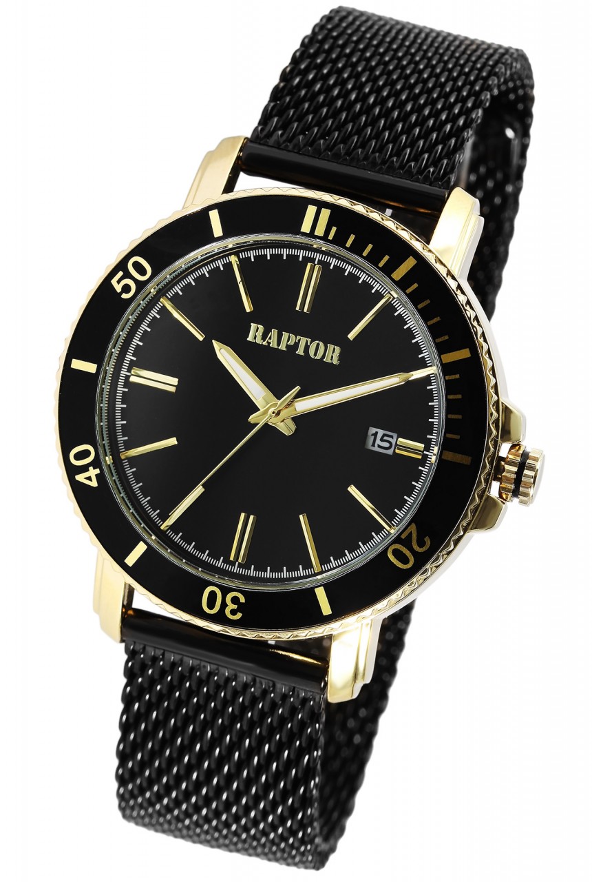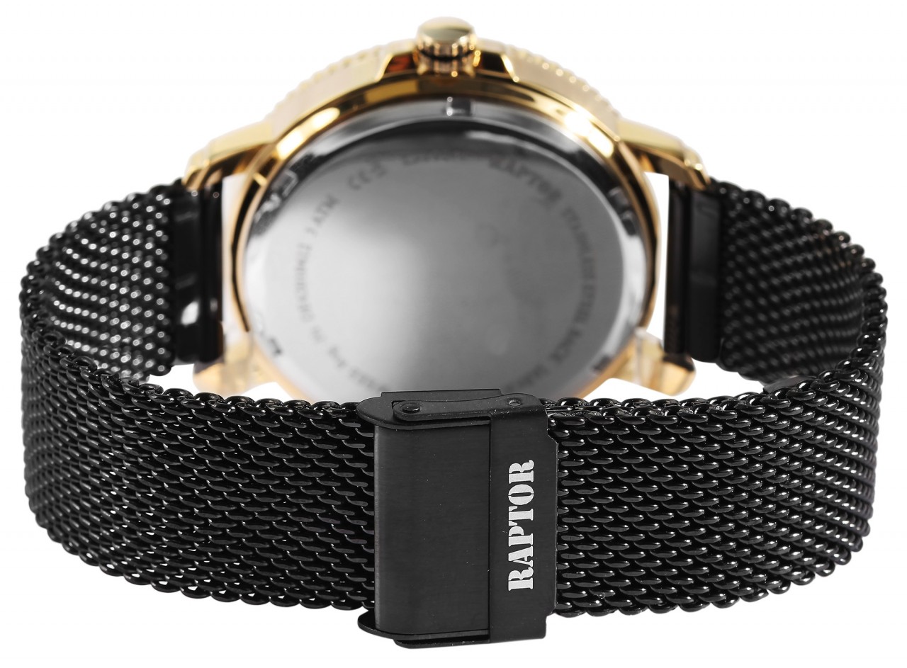 O relógio de pulso analógico masculino de 3 ponteiros da marca Raptor possui um movimento de quartzo de alta qualidade. A bracelete de malha fina é feita de aço inoxidável e tem uma largura de 20,5 mm. Pode ser aberta e fechada através de um fecho de gancho que pode ser ajustado individualmente, para que o comprimento da bracelete também possa ser ajustado a qualquer circunferência do pulso. O comprimento total do relógio é de 24,5 cm. A caixa redonda do relógio com vidro mineral tem um diâmetro de 42 mm e uma altura de 11 mm. O relógio também possui exibição de data às três horas e resistência à água de 3 ATM.