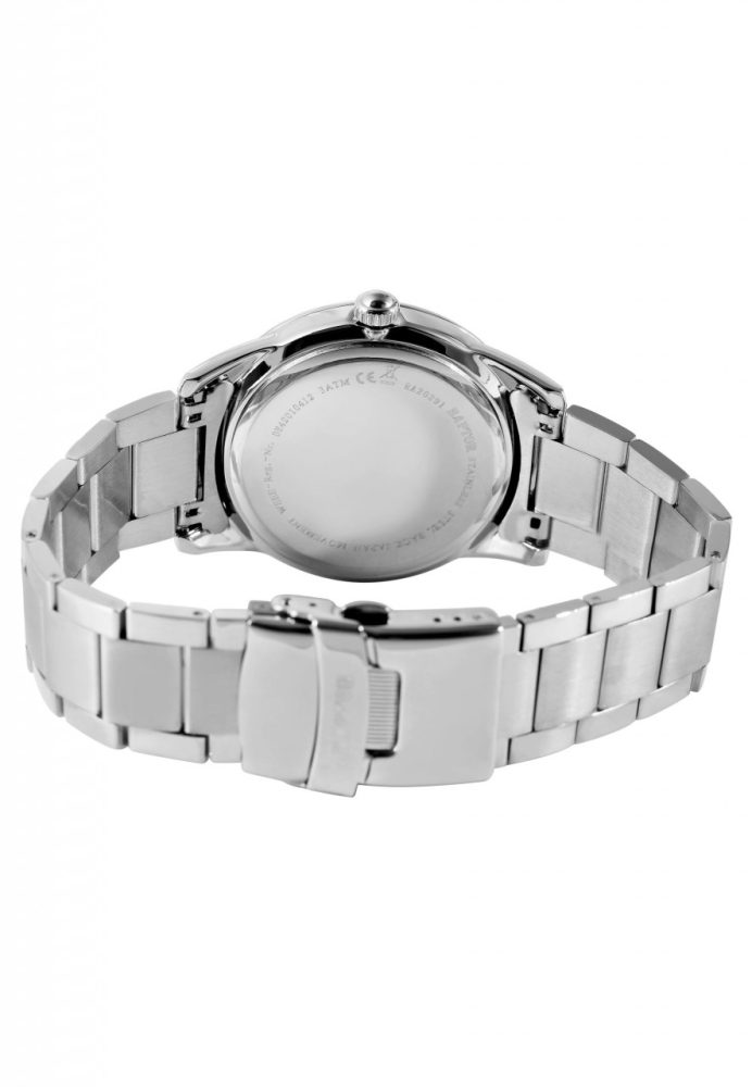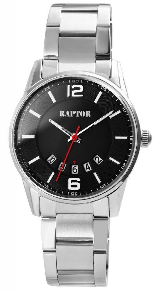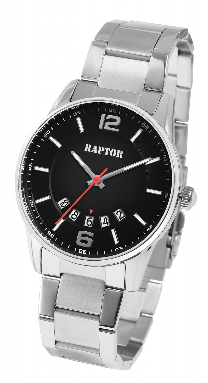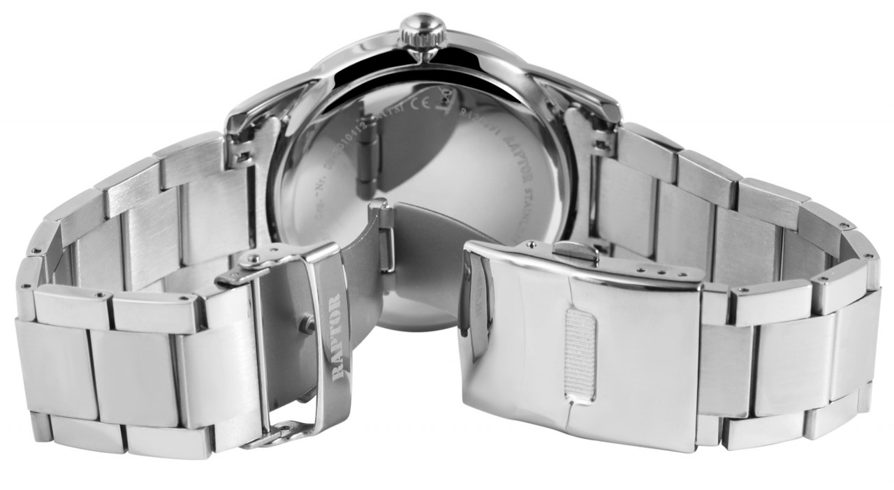 O relógio de pulso analógico masculino da marca Raptor “Queck” possui um movimento de quartzo de alta qualidade. A bracelete de aço inoxidável tem 22 mm de largura. O comprimento total do relógio é de 24.5 cm. A caixa de aço inoxidável com vidro mineral tem um diâmetro de 42 mm e uma altura de 10 mm. O fundo da caixa é feito de aço inoxidável e o relógio masculino é resistente à água até 3 ATM.