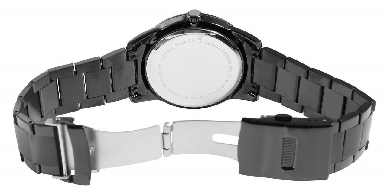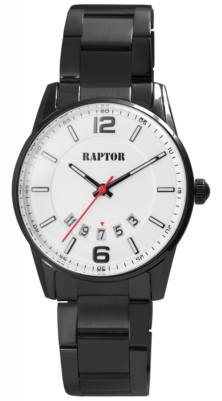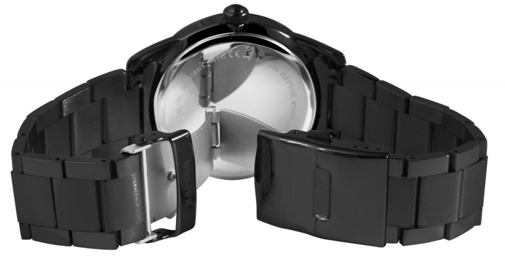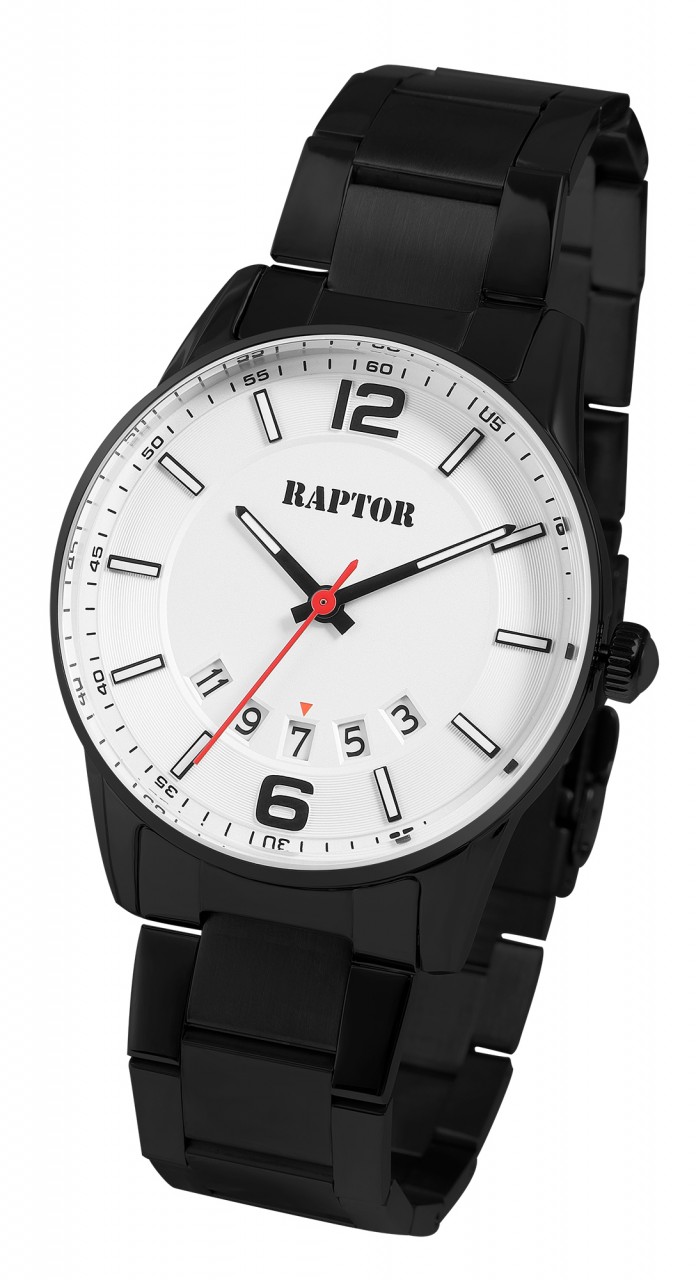 O relógio de pulso analógico masculino da marca Raptor “Queck” possui um movimento de quartzo de alta qualidade. A bracelete de aço inoxidável tem 22 mm de largura. O comprimento total do relógio é de 24.5 cm. A caixa de aço inoxidável com vidro mineral tem um diâmetro de 42 mm e uma altura de 10 mm. O fundo da caixa é feito de aço inoxidável e o relógio masculino é resistente à água até 3 ATM.