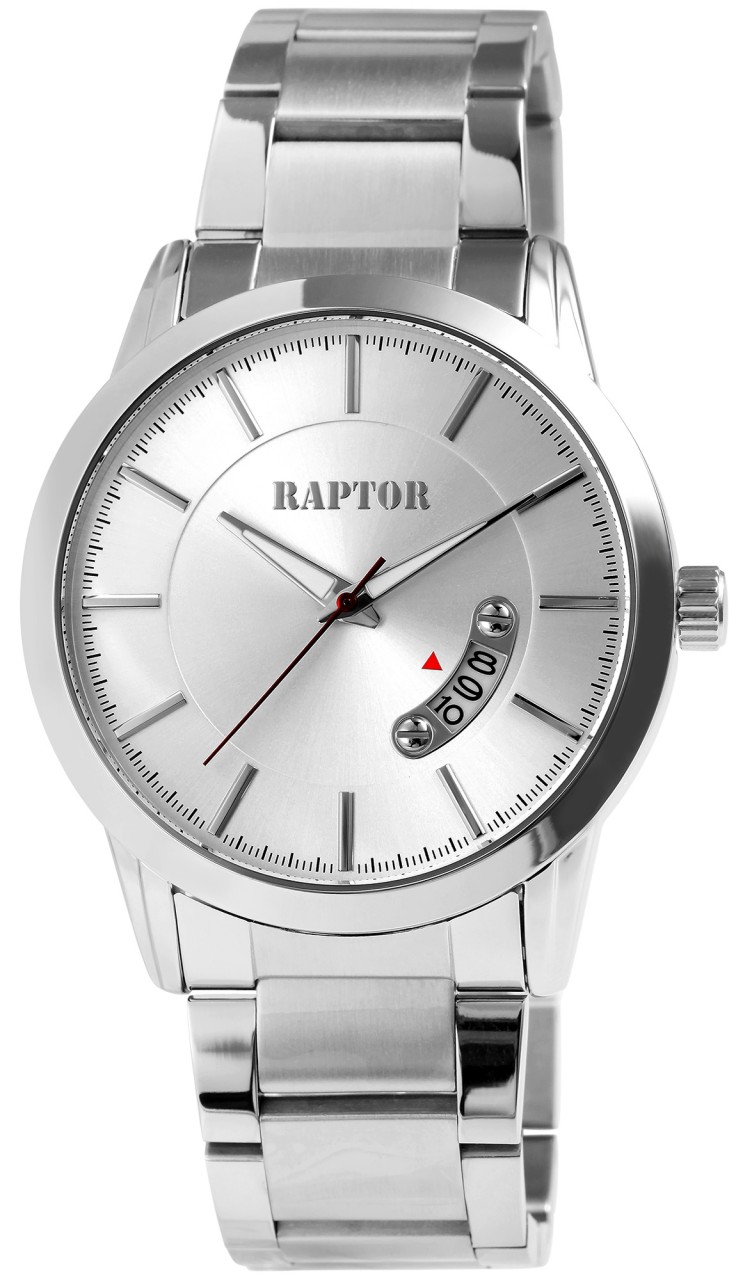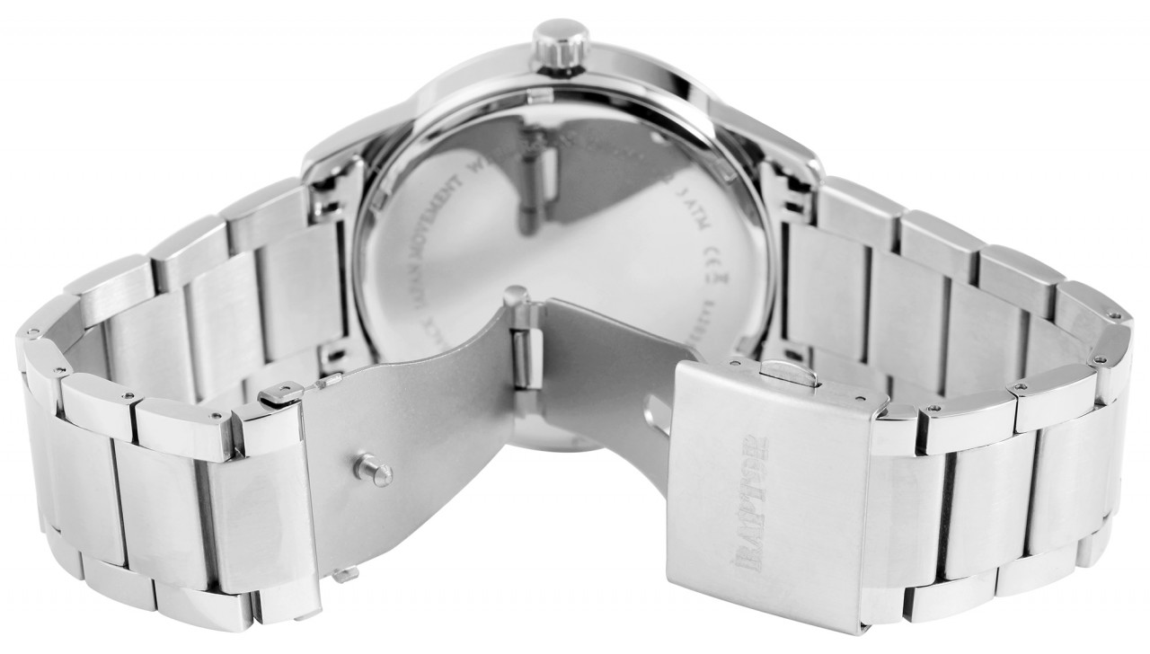 O relógio masculino da moda da marca Raptor possui um movimento de quartzo de alta qualidade. A bracelete de elos é feita de aço inoxidável e tem acabamento de superfície fosco e polido. Tem 24 mm de largura na extremidade, pode ser aberto e fechado com fecho dobrável em aço inoxidável e pode ser encurtado conforme desejado graças aos elementos removíveis. O comprimento total do relógio é de 23 cm. O fundo da caixa também era feito de aço inoxidável. A caixa de aço inoxidável com vidro mineral tem um diâmetro de 46 mm e uma altura de 11 mm. A divisão do mostrador é simples e clara. O ponteiro vermelho dos segundos se destaca habilmente. O relógio também possui uma exibição de data entre três e cinco horas.