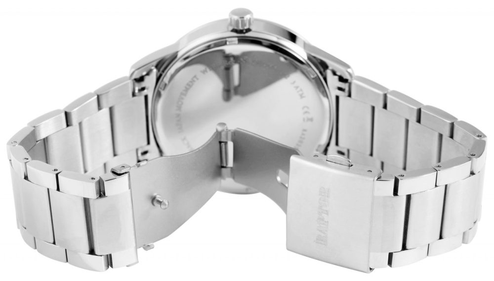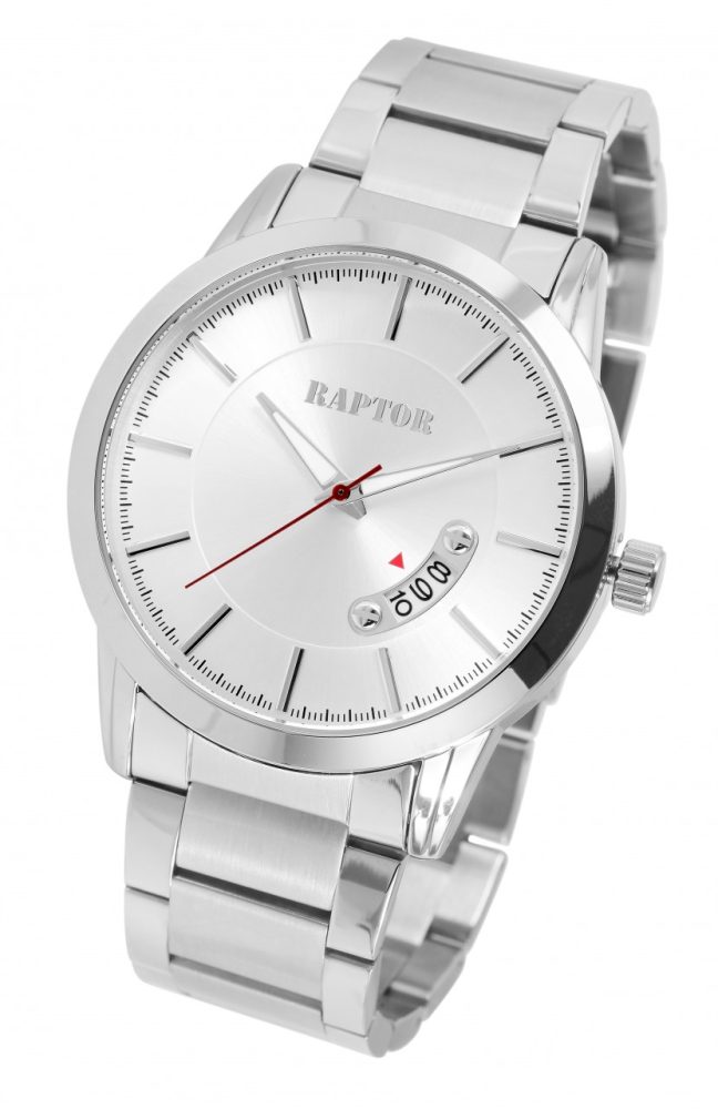 O relógio masculino da moda da marca Raptor possui um movimento de quartzo de alta qualidade. A bracelete de elos é feita de aço inoxidável e tem acabamento de superfície fosco e polido. Tem 24 mm de largura na extremidade, pode ser aberto e fechado com fecho dobrável em aço inoxidável e pode ser encurtado conforme desejado graças aos elementos removíveis. O comprimento total do relógio é de 23 cm. O fundo da caixa também era feito de aço inoxidável. A caixa de aço inoxidável com vidro mineral tem um diâmetro de 46 mm e uma altura de 11 mm. A divisão do mostrador é simples e clara. O ponteiro vermelho dos segundos se destaca habilmente. O relógio também possui uma exibição de data entre três e cinco horas.