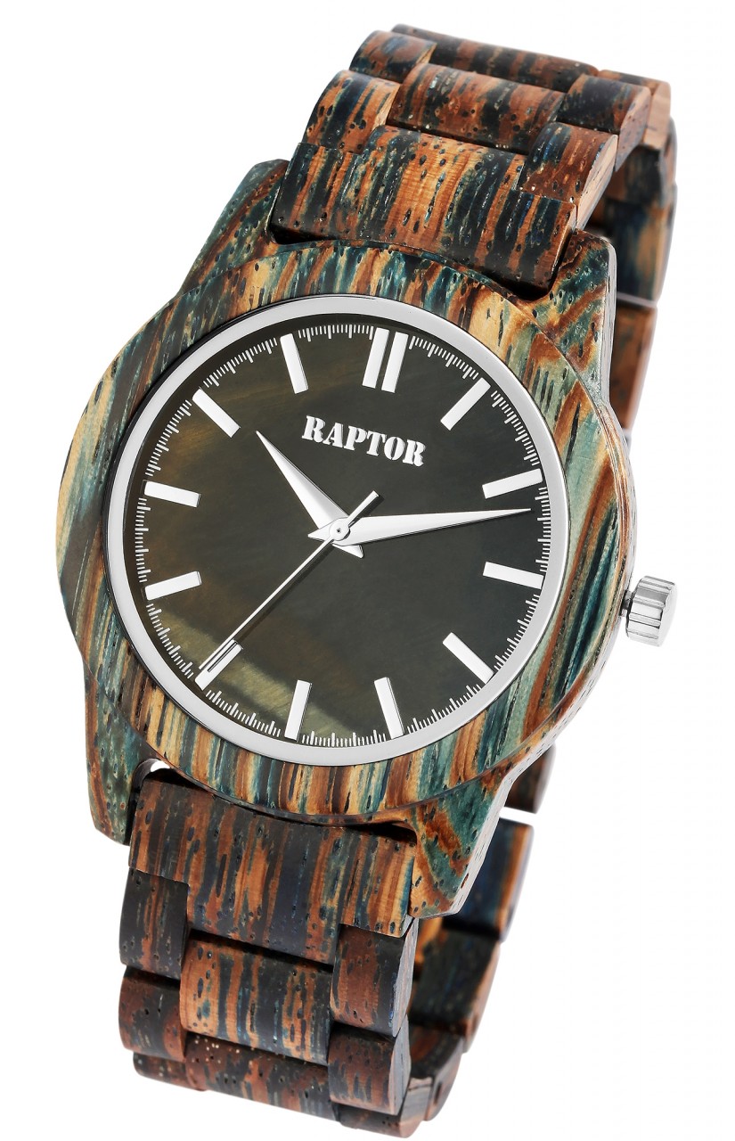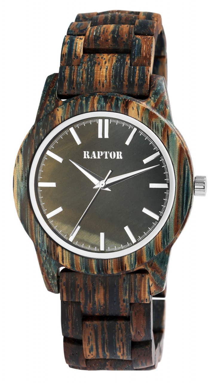 O relógio de pulso analógico masculino de 3 ponteiros da marca Raptor possui o movimento de quartzo de alta qualidade Miyota 2035. A bracelete de madeira tem 22 mm de largura na alça e pode ser aberta e fechada com um fecho dobrável de aço inoxidável prateado. O comprimento total do relógio é de 21 cm. A caixa de madeira com fundo de madeira da mesma cor e vidro mineral tem diâmetro de 43 mm e altura de caixa de 11 mm. O vidro mineral transparente tem uma borda espelhada contrastante e, juntamente com a coroa prateada, conferem ao relógio uma aparência elegante. O mostrador é feito de mármore e possui ponteiros e índices prateados. Inclui cartão de garantia e uma caixa original da marca Raptor.