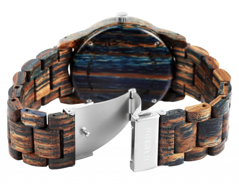 O relógio de pulso analógico masculino de 3 ponteiros da marca Raptor possui o movimento de quartzo de alta qualidade Miyota 2035. A bracelete de madeira tem 22 mm de largura na alça e pode ser aberta e fechada com um fecho dobrável de aço inoxidável prateado. O comprimento total do relógio é de 21 cm. A caixa de madeira com fundo de madeira da mesma cor e vidro mineral tem diâmetro de 43 mm e altura de caixa de 11 mm. O vidro mineral transparente tem uma borda espelhada contrastante e, juntamente com a coroa prateada, conferem ao relógio uma aparência elegante. O mostrador é feito de mármore e possui ponteiros e índices prateados. Inclui cartão de garantia e uma caixa original da marca Raptor.