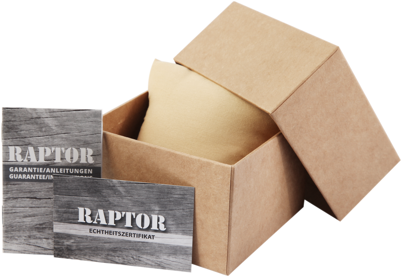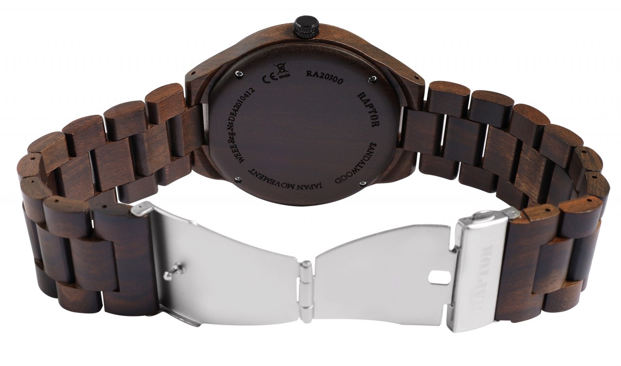 O relógio de pulso analógico de 2 ponteiros para homem da marca Raptor possui um movimento de quartzo Miyota 2035 de alta qualidade. A bracelete de sândalo castanho escuro tem 13 mm de largura na alça. Tem 26 mm de largura e pode ser aberto e fechado com um fecho dobrável em aço inoxidável prateado. O comprimento total do relógio é de 25 cm. A caixa em sândalo castanho escuro com vidro mineral tem um diâmetro de 52 mm e uma altura de 12 mm. O fundo da caixa também é feito de sândalo. O material leve significa que pode ser perfeitamente ajustado ao pulso e é muito confortável de usar.