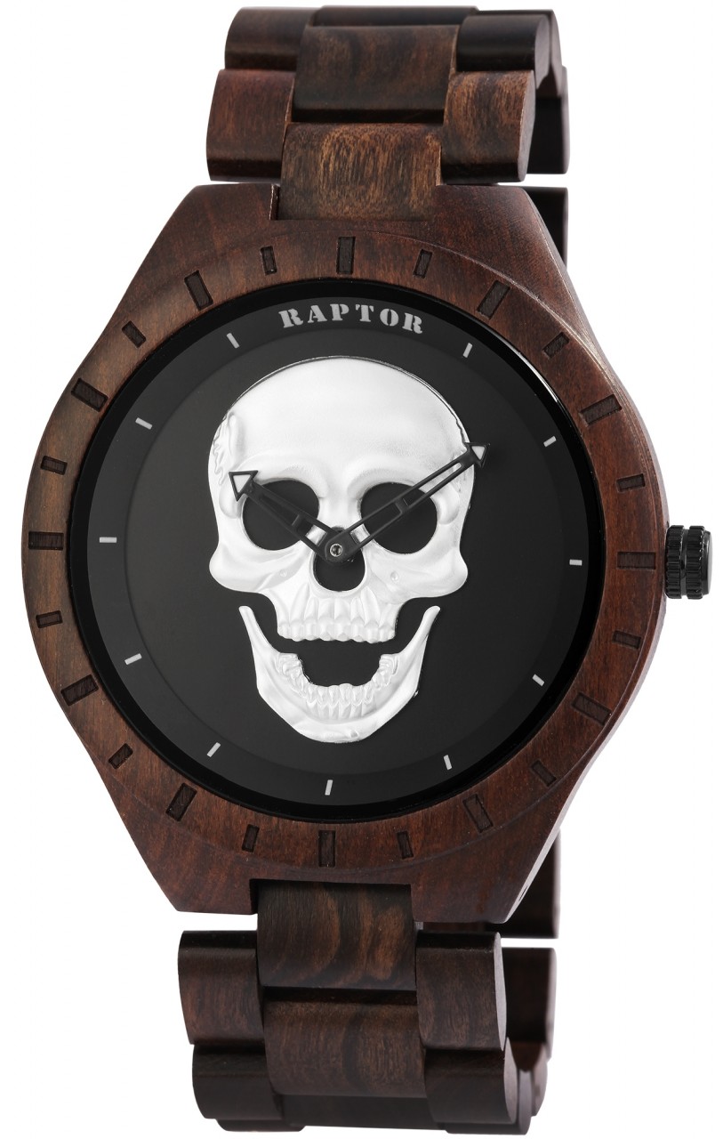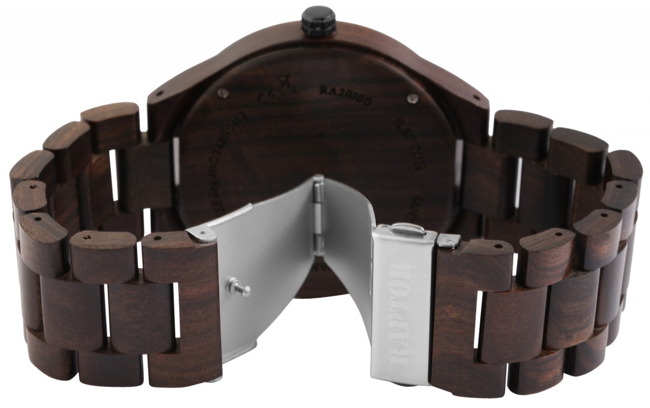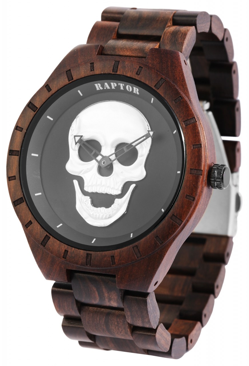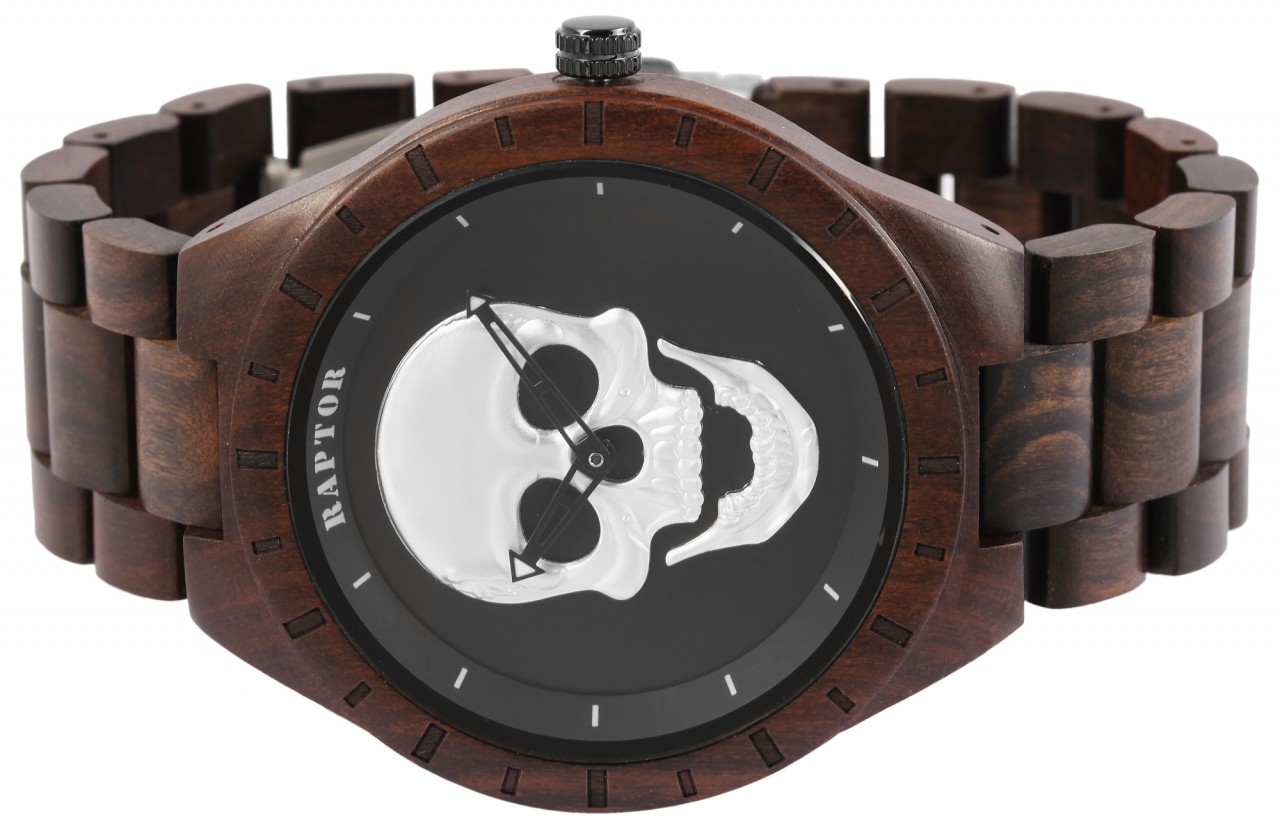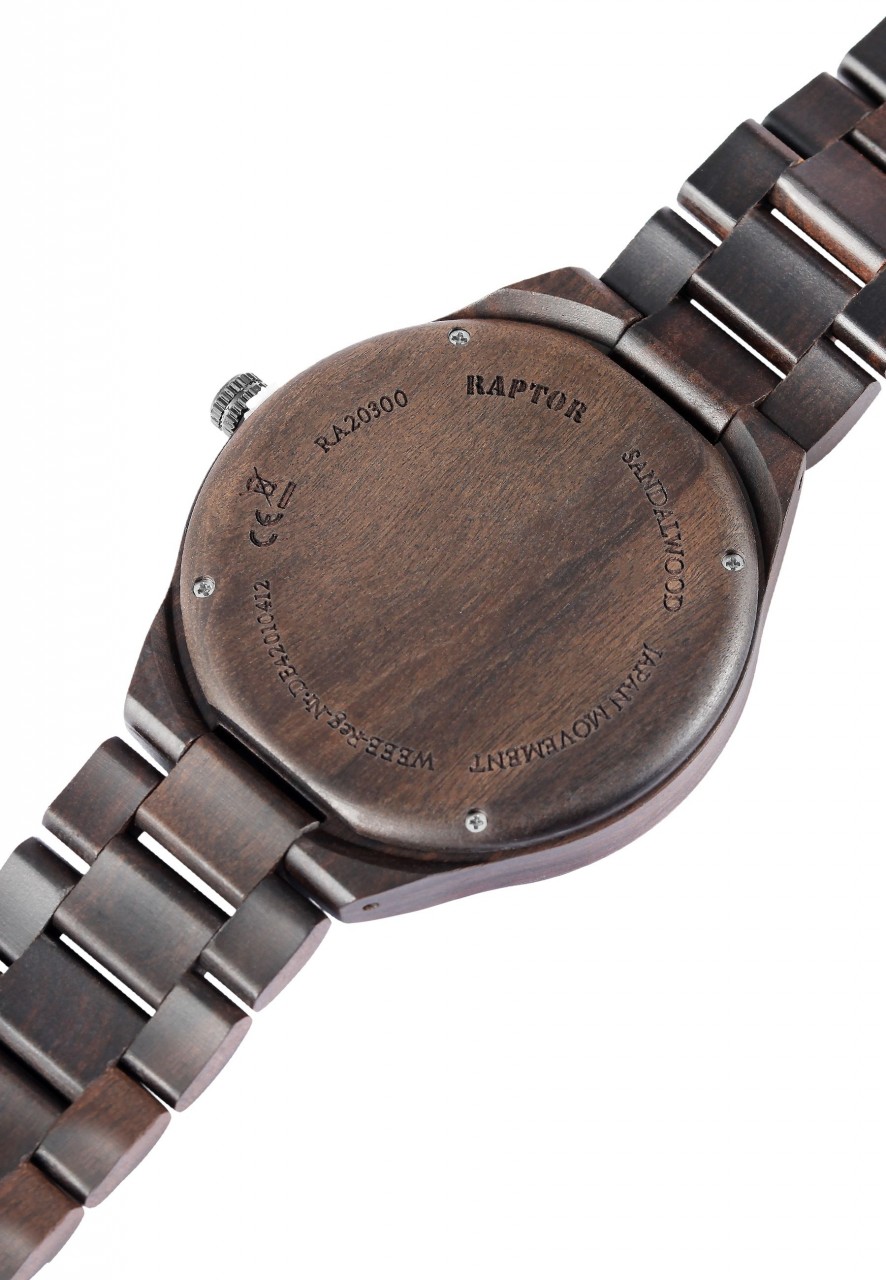 O relógio de pulso analógico de 2 ponteiros para homem da marca Raptor possui um movimento de quartzo Miyota 2035 de alta qualidade. A bracelete de sândalo castanho escuro tem 13 mm de largura na alça. Tem 26 mm de largura e pode ser aberto e fechado com um fecho dobrável em aço inoxidável prateado. O comprimento total do relógio é de 25 cm. A caixa em sândalo castanho escuro com vidro mineral tem um diâmetro de 52 mm e uma altura de 12 mm. O fundo da caixa também é feito de sândalo. O material leve significa que pode ser perfeitamente ajustado ao pulso e é muito confortável de usar.